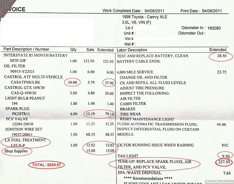 even though I told my gf's parents I'd do the work, they are proud people and insisted they take care of an oil change, battery swap, and transmission flush. They took it to an ostensibly reputable shop in Cary, check out this invoice (I circled the things that blew my mind in cost and/or WRONGness)