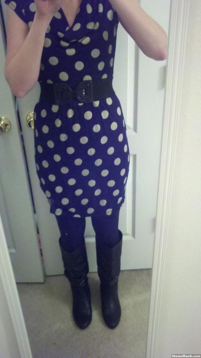 Those aren't rain boots anyway, just flat black leather boots. Not the biggest fan of navy + black together, it'd be better if they were dark brown or w/o the blue tights.