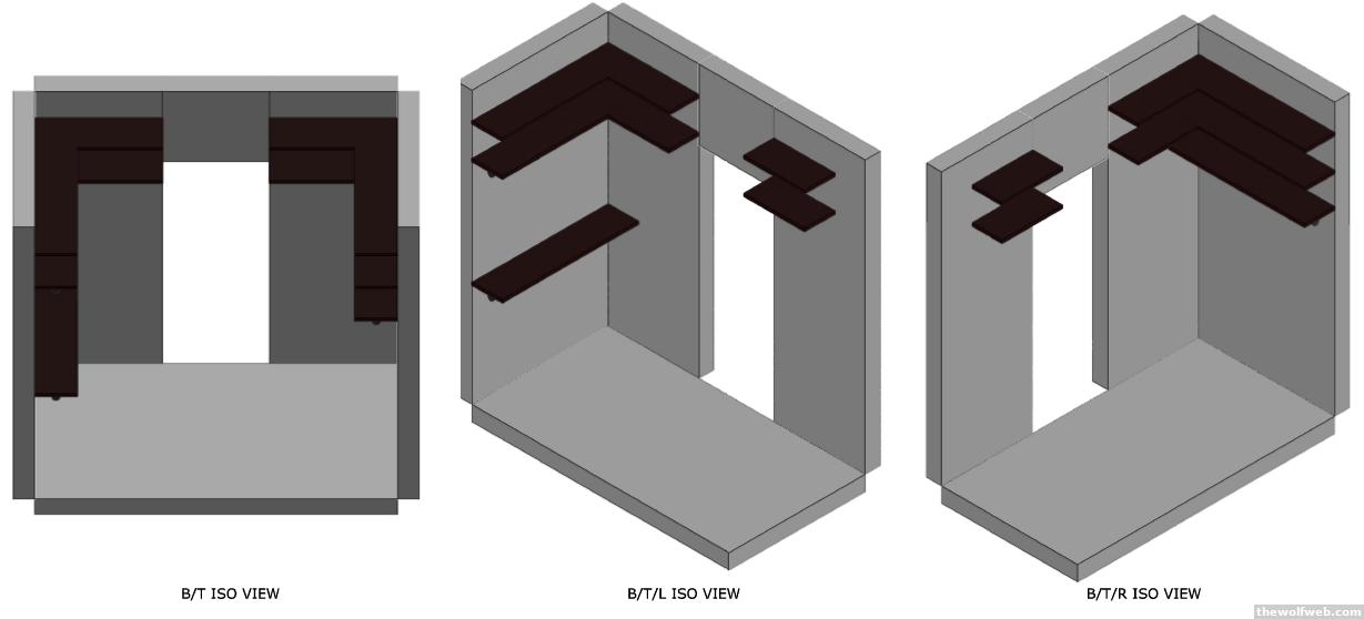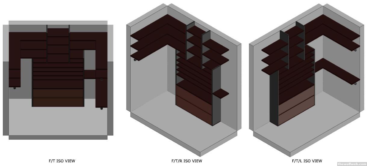 So I'd like to build some closet organizers for my new house. I've drawn up some plans; however, I'm looking for input from you all (and have a record of my thoughts )Notes:- Provide hanging area for long clothes (dresses, etc.)- Provide stacked hanging area for regular clothes (shirts, pants, etc.)- Provide shoe storage (as many as possible)- Provide at least 1 drawer (2 shown; however, one will be customized to fit a safe behind a false drawer face)- Provide reachable shelving for often used items/clothing- Provide high storage for seldom used/seasonal items- Maximum storage/shelf spaceDrawings:- Based on assumed dimensions, for now- View names can be confusing, e.g. Right View shows left wall; Left View shows right wall; Front View shows back wall; Back View shows Front Wall (views are named according to the viewpoint, not the object shown)Concerns:- Biggest concern is how to properly construct. I don't like the look of "runners" (supports under each shelf); however, that's probably the easiest. I could use backing boards to attach the shelves to from outside of the backing boards, so I'd be doing a pre-fab and installing each side as a unit, though I'm not sure if this would be strong enough.- Depending on support type, not exactly how to secure shelves at the corners- Do I need some vertical supports on the side/front shelves?- Type of material (MDF, Laminated particle board, Hardwood)?I'd like any input on the design in general as well. Thanks]