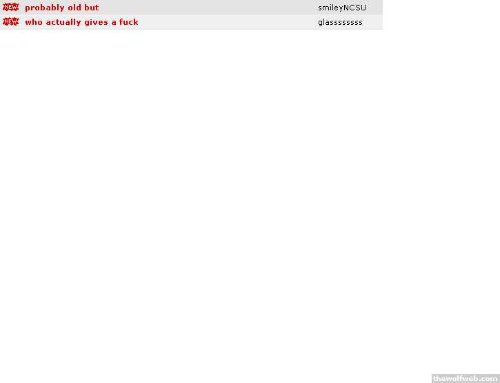 probably old but smileyNCSU 10 78 11:38 AM by smileyNCSU rumor has it (Page 2 3 4 5) NCSUGirl83 221 2458 11:35 AM by glassssssss MY FUCKIN CAR GOT TOWED!!