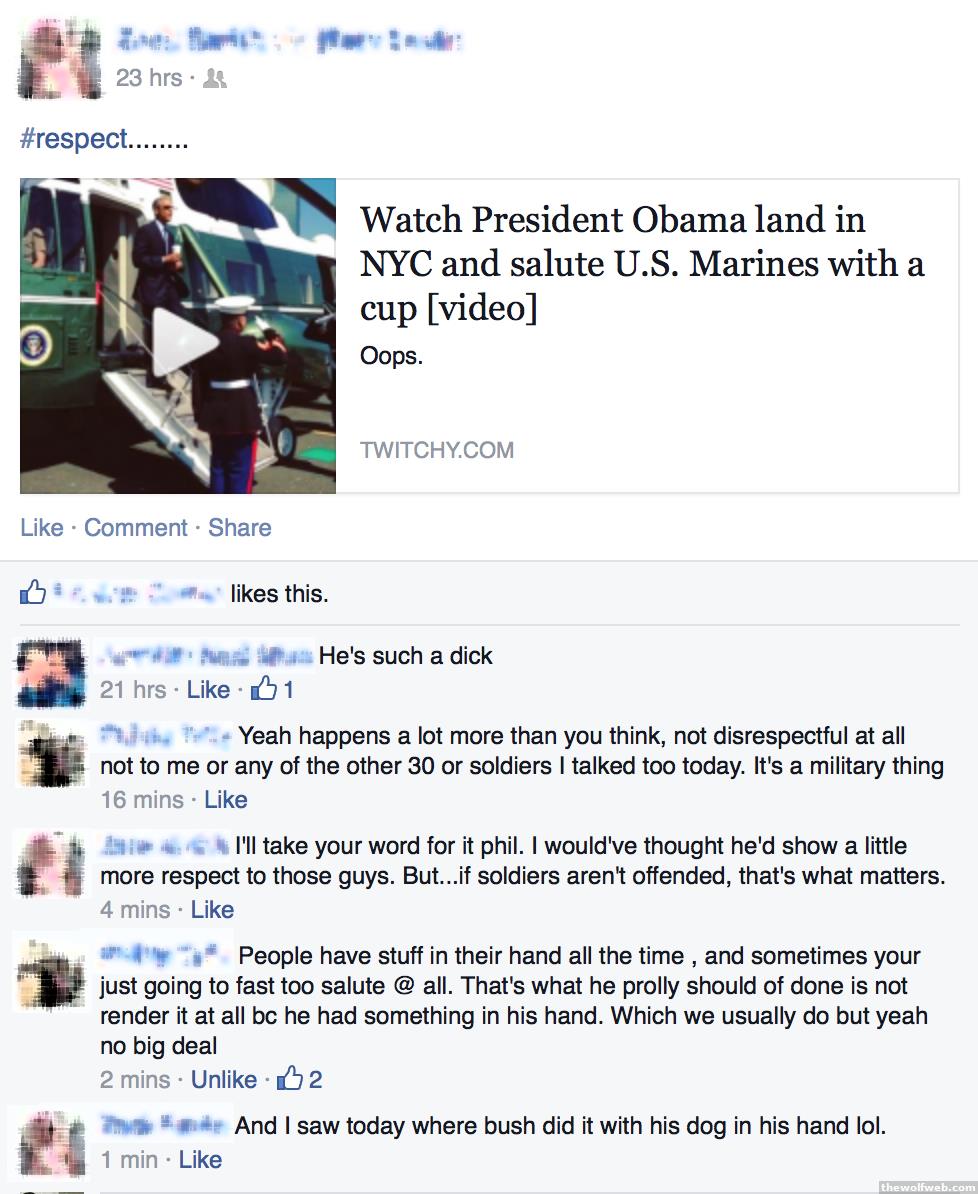 http://abcnews.go.com/blogs/politics/2014/09/president-obama-gesture-to-marines-dubbed-latte-salute/This has been making the rounds on Facebook.Doesn't seem like a big deal to me... i'm not sure what the rules of civilian salutes really are, but we just officially started a proxy war with Syria, i'm thinking the president has bigger things on his mind