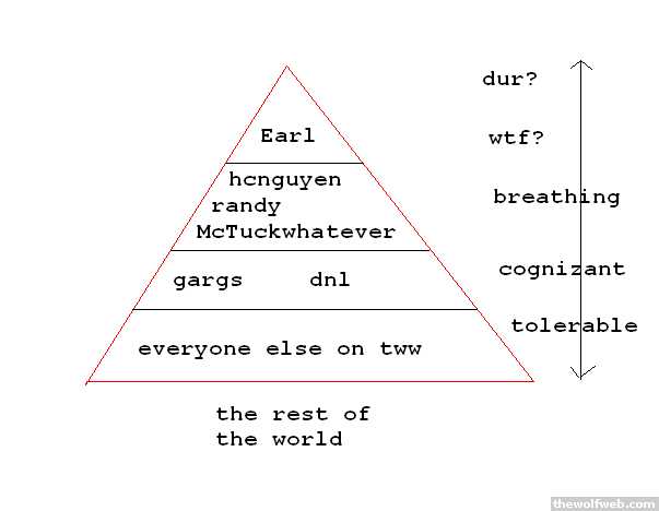 behold the pyramid of ignorance:apologies for the crudeness of the drawing, paint only allows so many user functions in under 3 minutes...feel free to disagree or agree, the pyramid is subject to change, as posters can move up on the scale easily, but once at the top, it becomes very difficult to come back down.[Edited on October 26, 2006 at 7:39 AM. Reason : ]