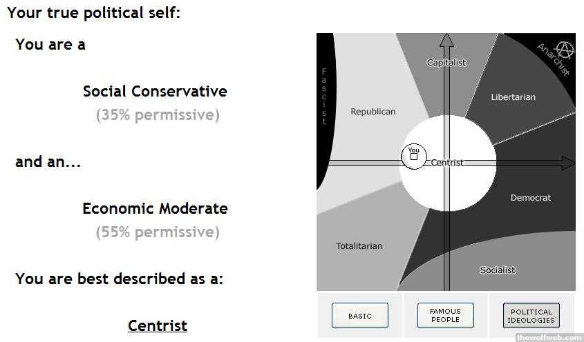Your true political self:You are a Social Moderate (55% permissive)and an... Economic Conservative (78% permissive)You are best described as a:CapitalistYou exhibit a very well-developed sense of Right and Wrong and believe in economic fairness. loc: (