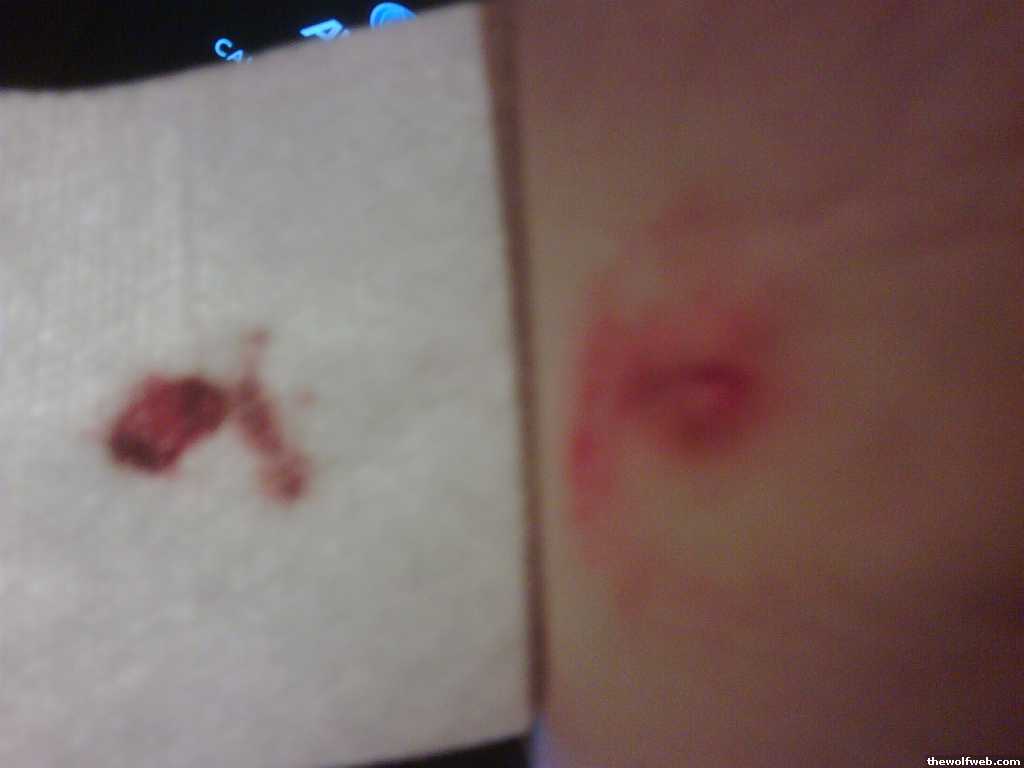 So a couple days ago it did pus a little bit but it wasn't worth taking a picture of because it wouldn't have looked any different than the first. I popped it and cleaned it up.Later on I got a fever and what I thought was a cold but now i'm wondering if it was related to the bite.Now the fever is gone and I still have a little bit of a cough but i've had this cough/sore throat for a week anyway, before the dog bite/accident. The wound is twitching a little bit probably to the nerve damage i'm afraid I might have received. I have no health insurance. I'm skurred [Edited on December 15, 2008 at 5:55 PM. Reason : and it's a little red.. not scary red, but definately red.]