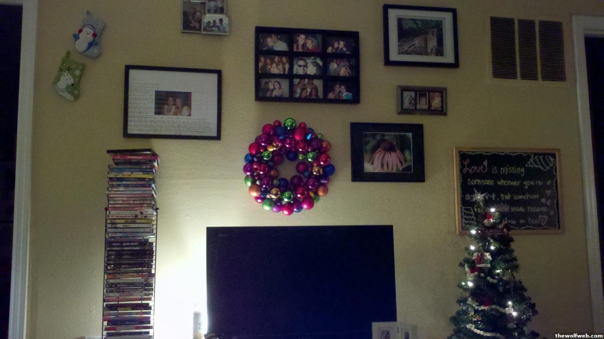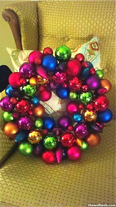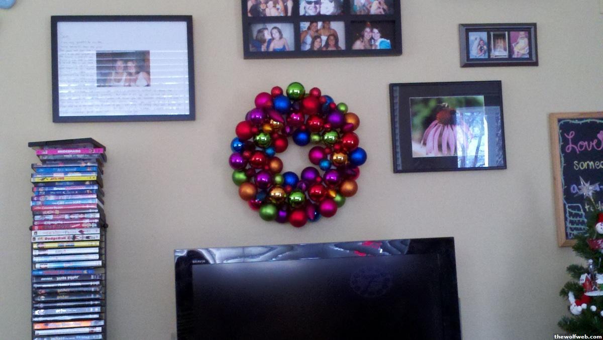 My ornament wreath! I'm going to add some white lights into it since my friend said it reminded her of Christmas lights