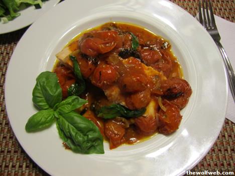 ^^^ It's from For Cod and Country.Add a handful of smashed garlic cloves to 1/4 cup of smoking olive oil; they'll brown almost immediately. Add 2 pts of cherry tomatoes, lots of salt, and cook until the skins begin to blacken. Lay two skin-on fillets on top of the tomatoes, skin-side up. Place under the broiler until done (took about 7 minutes for me; the skin will char quite a bit). Plate the fillets, stir basil and shallot into the tomatoes, and spoon over the fillets.I thought it was delicious. I'll probably add some red pepper flakes with the tomatoes next time. The wife thought the tomatoes were a little much, so I'll probably also add a little sugar at the end and serve over linguine.