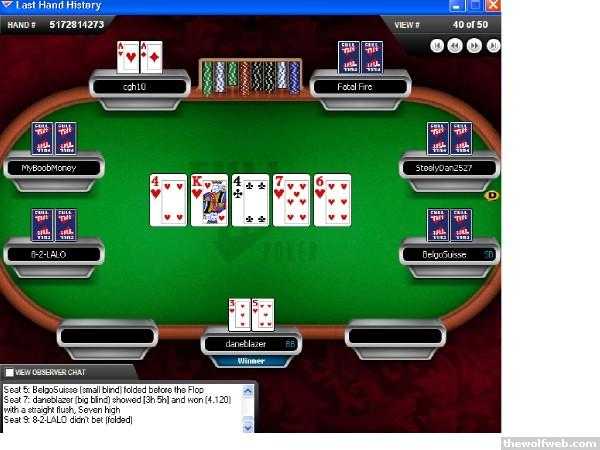 I'll go ahead and post a bad beat so you guys don't think I run like god.Full Tilt Poker Game #7304245818: $40,000 Guarantee (52850659), Table 83 - 150/300 Ante 25 - No Limit Hold'em - 17:33:30 ET - 2008/07/20Seat 1: Mattutaylor (4,143)Seat 2: americanhustler (7,089)Seat 3: rafampvieira (3,941)Seat 4: Jsilva23 (5,465)Seat 5: McGuiler (15,788), is sitting outSeat 6: Havoc14 (10,831)Seat 7: david0603 (16,610)Seat 8: Svennis111 (3,096)Seat 9: ibra99 (8,135)Mattutaylor antes 25americanhustler antes 25rafampvieira antes 25Jsilva23 antes 25McGuiler antes 25Havoc14 antes 25david0603 antes 25Svennis111 antes 25ibra99 antes 25Svennis111 posts the small blind of 150ibra99 posts the big blind of 300The button is in seat #7*** HOLE CARDS ***Dealt to david0603 [Kh Ad]Mattutaylor foldsamericanhustler foldsrafampvieira foldsJsilva23 foldsMcGuiler foldsHavoc14 foldsdavid0603 has 15 seconds left to actdavid0603 raises to 750Svennis111 foldsibra99 calls 450*** FLOP *** [Ac 7c Ah]ibra99 checksdavid0603 has 15 seconds left to actdavid0603 bets 1,200ibra99 has 15 seconds left to actibra99 raises to 4,000david0603 raises to 14,400ibra99 has 15 seconds left to actibra99 calls 3,360, and is all indavid0603 shows [Kh Ad]ibra99 shows [Ts As]Uncalled bet of 7,040 returned to david0603*** TURN *** [Ac 7c Ah] [Jc]*** RIVER *** [Ac 7c Ah Jc] [Tc]david0603 shows three of a kind, Acesibra99 shows a full house, Aces full of Tensibra99 wins the pot (16,595) with a full house, Aces full of Tens*** SUMMARY ***Total pot 16,595 | Rake 0Board: [Ac 7c Ah Jc Tc]Seat 1: Mattutaylor folded before the FlopSeat 2: americanhustler folded before the FlopSeat 3: rafampvieira folded before the FlopSeat 4: Jsilva23 folded before the FlopSeat 5: McGuiler folded before the FlopSeat 6: Havoc14 folded before the FlopSeat 7: david0603 (button) showed [Kh Ad] and lost with three of a kind, AcesSeat 8: Svennis111 (small blind) folded before the FlopSeat 9: ibra99 (big blind) showed [Ts As] and won (16,595) with a full house, Aces full of Tens