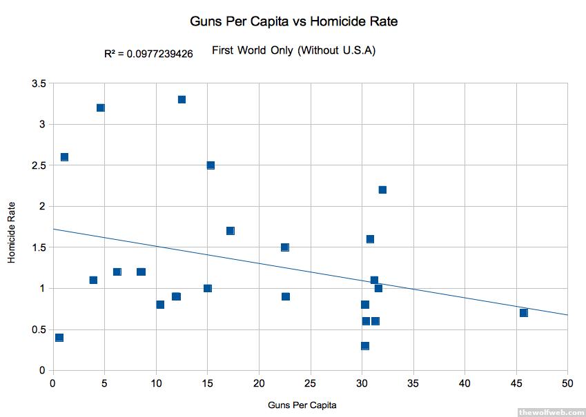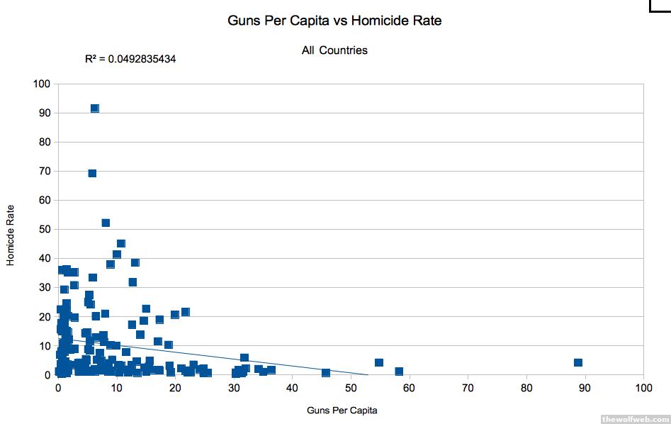 Posted without comment, using data from the following sources:https://en.wikipedia.org/wiki/List_of_countries_by_intentional_homicide_ratehttp://en.wikipedia.org/wiki/Number_of_guns_per_capita_by_countryOnly known possible anomaly is that in one list they have "England / Wales" and the other, "United Kingdom", it is assumed that these are the same for the purposes of generating the graphs.
