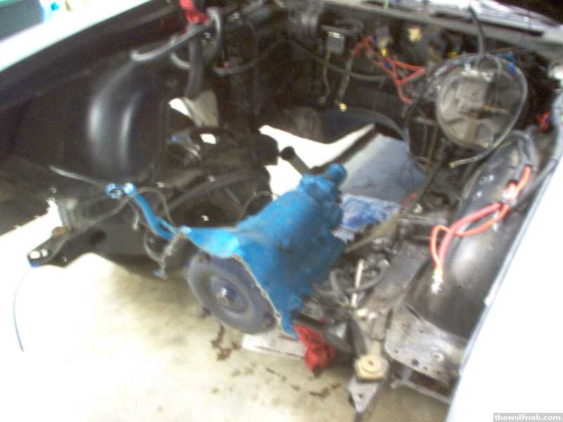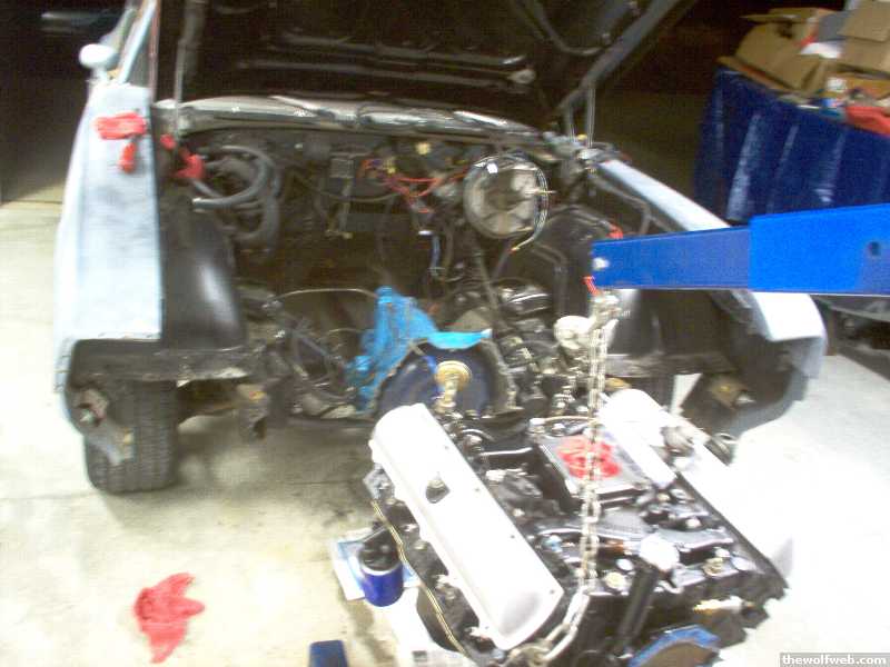 Dave: What I do is pull the front end off and pull the engine and transmission as an assembly. Easy to remove, and easier to put back together, can be done all by myself if need be and I dont have to fuck with the hood alignment. Once you do it the first time and get all the rusted bolts broke loose it gets real easy to do it again. I painted the whole radiator support and all its parts the first time I took it apart too. Now I leave the radiator and fan shroud on the radiator support and just take the whole thing off at once. Take the bumper off at the frame (4 bolts), take the grilles and headlight housings off (9 bolts), take the front wiring harness loose and get it out of the way, then it is 13 bolts per side to get the radiator support off but all of them are 1/2in except for the body mount bolt so thats easy. Drain all the fluids while you do this. Then get that bitch out of the way and start unhooking the engine shit. Wiring, oil pressure and temp sender lines, 4 vac. lines, PS hoses, ground straps, heater/radiator hoses, etc. Then under the car take the exhaust loose, get rid of the starter, undo the motor mount thru bolts, undo the shift linkage, speedo cable, kickdown cable and unbolt the transmission mount to crossmember bolts. Take the 4 crossmember bolts out of the frame and take the driveshaft off. You can leave the oil filter on but its probably gonna get fucked up, mine always does but who cares. Then let the car down on the ground, and hook up the hoist. Support the transmission with a floor jack and hammer the crossmember back about 8-10 inches in the frame then yank it all out. Today I set the transmission back down on the frame where the engine goes and unbolted it right there and left it lol. You know the rest. Oh yeah I have a hoist. Eric: I pulled the valve covers today but everything looked great up top. The problem is down below. I am taking it back to HRT tomorrow morning.