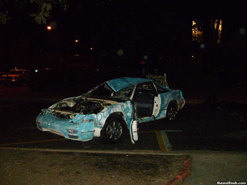 whoever gets pissed about the car getting flipped is gay as hell. it IS supposed to be drained of gas when you get it for a car bash idiot. Also i think it was funny they flipped it. This crowd was tame as hell, quiet, they forgot to bring the 83 championship which has been played out there for years, they lost their thing to show the movies on like 3 times. THEN they try to threaten to not give out student tickets....haha thats funny, have the whole place empty? Then the campus police busting people all over the place for drinking when they weren't even making any noise...they just showed up at the tent and put the flashlights on these people. This university and traditions just keeps getting worse and people bitching about the car just eggs it on.