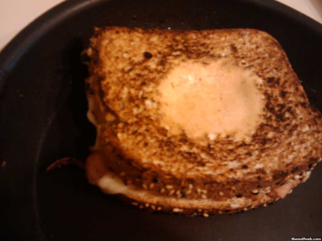 thick cut apple bacon, bitted up and fried, in a grilled cheese made with smoked gouda, and an eggie in the basket in the middle of the bacon grilled cheesesometimes i get bored in the kitchen and weird awesomeness like this happens