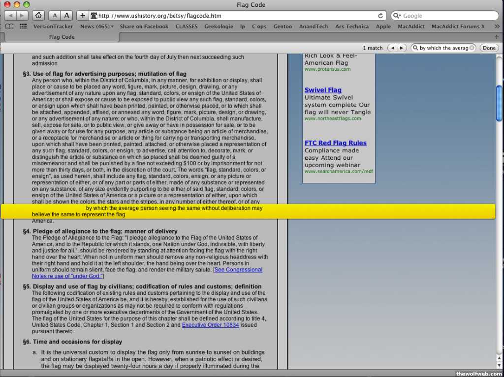 step 1: go to http://www.ushistory.org/betsy/flagcode.htmstep 2: hit control+f (on a pc) or command+f (on a mac) or manually go to searchstep 3: for the search string, enter "According to the Flag Code, a flag is a flag"step 4: searchstep 5: realize the word "according" was found only twice in the link, and that moron is incapable of admitting when he fucked up, even when his general point is correct![Edited on May 7, 2010 at 1:47 AM. Reason : ^cool, your highlighted text starts with "by which"...why not with "According to"? Hmmm]