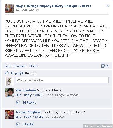 Y'all need to check this out. Chef Gordon did a kitchen nightmare episode on this restaurant and he had to walk out. It was nuts! They were screaming at customers, I thought it was for show. Well they have a Facebook page and reddit caught wind. It is full of hilarity...http://www.facebook.com/amysbakingco?ref=stream