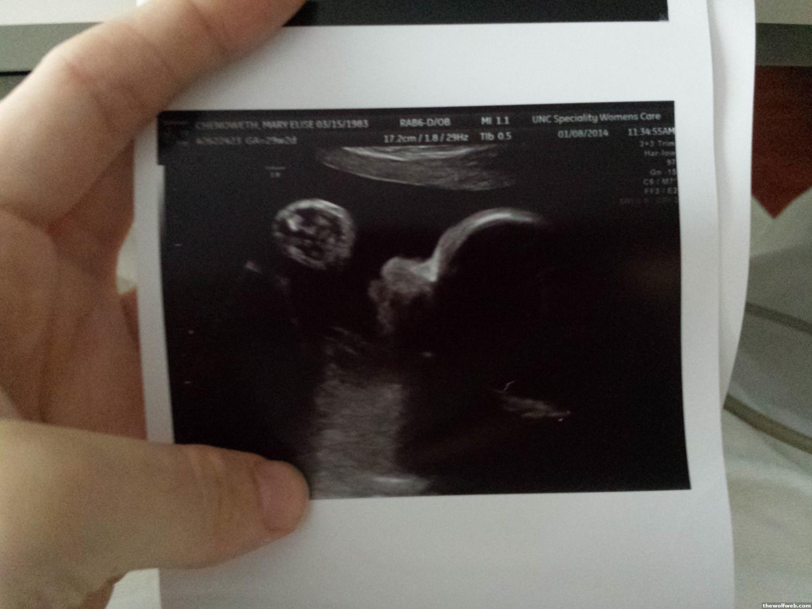 Saw the high risk specialist. Got a 4D photo of my squishy faced baby. He is fine. Very healthy. About 4 pounds. I have to stay at least one more night and then they will decide what to do if the bleeding doesnt start again and the contractions are manageable. If I bleed heavily again I will be admitted until the baby is born. Due date is March 24.