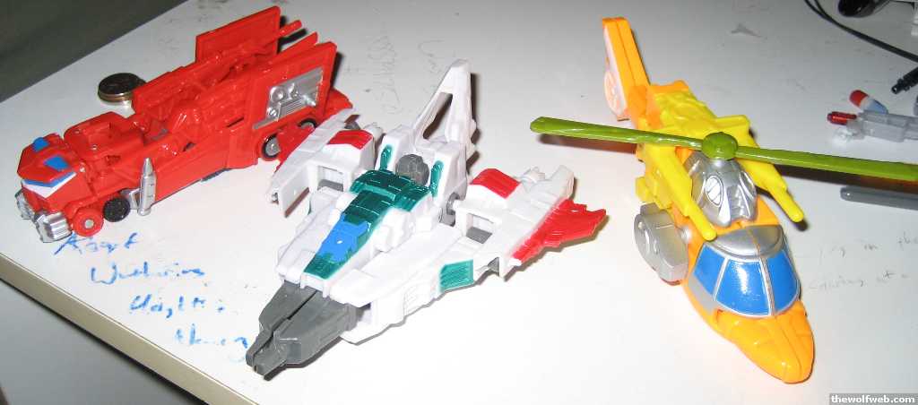 Got some pretty cool KOs today at Big Lots on Western. They're Legends of Cybertron molds made into figures that are between basic and deluxe size. The colors are pretty good, and the Prime has the wings and weapons from the leader size Galaxy Force Prime that the LOC figure doesn't. They all come with guns that the LOCs didn't have, but they're sort of pointless since the molds don't really bend at the elbow. Starscream has a gun and a sword that fold out of his wings, but I forgot to put them out. Evac looks damn good in vehicle mode. Not bad for $6 total.Jetfire and Megatron are on the cards, but I didn't see any in the store. I left another Prime and a Hot Shot (didn't like the colors). Also of interest is that the art on the card is of the genuine leader- and ultra-size figures (unlike the G2 and Beast Wars KOs). ]