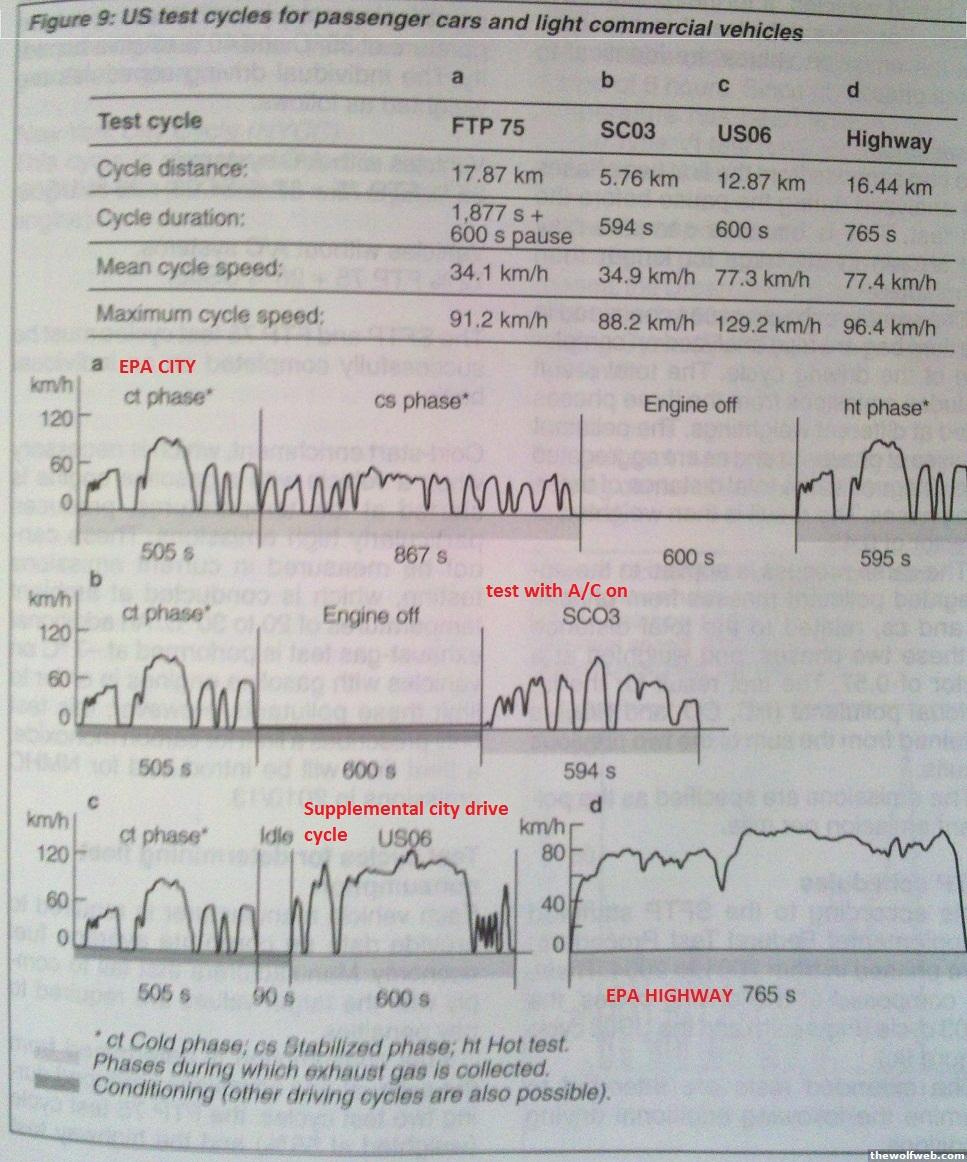 Recently a woman won a lawsuit against Honda having to do with the fuel economy claims for a Civic hybrid in California. There is a lot of confusion about the way fuel economy is calculated. The current method is the 5 cycle approach but that changes. There are a bunch of calculations done with certain coefficients that have all been boiled down into a spreadsheet:http://www.epa.gov/oms/cert/dearmfr/cisd0709_enclosure2_calculator.xlsSo the manufacturers run an FTP75 warm (75F) cycle, FTP75 cold (20F) cycle, a USO6, an SC03, and the highway test. I have mentioned these tests before: 1. The FTP75 is the "city" drive cycle that's been around for a long time, and may also be called LA-4. 2. The US06 is the high speed drive cycle, not to be confused with the highway test. This was first introduced about 10 years ago.3. The HFET is the old "highway" test cycle that's been around for a long time.4. The SC03 has the vehicle drive with the air conditioning on in a dyno room with very expensive heat lamps meant to simulate the effect of the sun.the bag part refers to the sampling bags that are taken after segments of a particular test. The exhaust air is captured inside a bag using very expensive equipment. It takes millions and millions of dollars to do these tests. The EPA can change the weight of the drive cycles if they want to; it comes down to them in the end, although they consult with the industry when making a change.[Edited on February 4, 2012 at 9:01 AM. Reason : .]