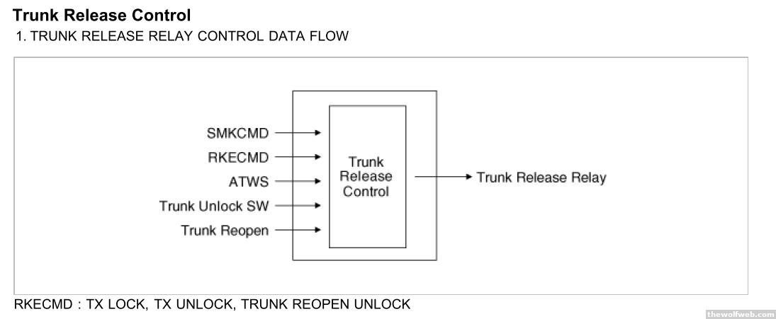 ^ Troll user is trolling. However the topic of the trunk release is actually kind of interesting because it relates to a trend in the newest vehicles, which is a smart keyless fob. A conventional keyless entry system has a fob with an unlock button. Smart key systems will unlock (or give permission to unlock) the doors, steering wheel, and the trunk based on proximity while also being used for push-button start. Consider this diagram showing components in the smart key system of the Hyundai Genesis coupe:boxed in red is the smart key control module which uses serial communication to send and receive commands from other control modules. Through the serial network it can work with the immobilizer system to maintain security. when the key fob is within range, it will communicate wirelessly with the smart key control module. The Smart key module can then issue commands that give permission for a button on the door to allow vehicle entry, or it can allow activation of trunk/hatch release. It will also release the steering wheel lock. In this particular vehicle, the body control module will activate the trunk release relay according to this block diagram:RKECMD = Remote Keyless Entry command [conventional Keyless system]SMKCMD = Smart Key system commandATWS = Anti-Theft Warning System [related to immobilizer/security]For this vehicle the smart key itself communicates with two different frequencies[Edited on February 18, 2012 at 6:14 PM. Reason : .]