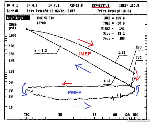 On the last page I discussed Honda's cylinder deactivation and displayed an image showing a very basic Pressure-Volume indicator diagram. I want to discuss these further, as they are very important for understanding many different types of engines. A pump or engine of some sort that does work is going to convert a larger volume of air into a smaller volume of air at higher pressure, and then expand it out. We can understand this by looking at a Pressure-Volume trace, which should be looked at as a cycle. Pressure-Volume diagrams can be traced back to steam engines: This 18th century apparatus would move a writing instrument upward in response to an increase in pressure, and slide it to the side as volume changed. By understanding the area under the curve we can get an idea of how much basic work is being done, and then ultimately figure out other stuff if we have enough information. Let's fast-forward to the early 90s, to the development of the Navistar T444E diesel engine, more popularly known as the Ford Powerstroke 7.4. Here is a Pressure-Volume indicator diagram of the engine at heavy load and high rpm [for a diesel]:X axis is crank position and Y axis is combustion chamber pressure. The area under the upwardly sloping area of the curve shows the IMEP (red text), or Indicated Mean Effective Pressure. The more compression and expansion performed on the gases, the greater the IMEP. Higher IMEP is directly related to greater usable engine output. The lower portion of the curve shows the Pumping Mean Effective Pressure or PMEP. This shows energy expended moving air in and out of the cylinder. I'm not as familiar with all the ins and outs of how this can look on a diesel engine, but the shape of this curve can vary according to a lot of factors. Valve timing, scavenging effects, and manifold design play a big role. On a gas engine throttle position will affect PMEP, with a wide open throttle reducing pumping losses.qualitatively speaking, IMEP - PMEP = NIMEP is the basic relationship, where NIMEP = Net Indicated Mean Effective Pressure . Note that in the diagram, EVO = Exhaust Valve Open and IVC = Intake Valve ClosingIn the past I have made references to something called Brake Mean Effective Pressure. This is a way of measuring engine performance and load independent of characteristics like displacement. Brake Mean Effective Pressure takes the NIMEP and subtracts frictional losses. I imagine NIMEP and IMEP are often used interchangeably. I think the best way to make sense out of IMEP/BMEP is to compare numbers from a lot of engines. Generally speaking, newer engines have much higher specific output and will achieve higher BMEP numbers when run at full load (either through more forced induction or just better naturally aspirated performance). Here is a pressure and temperature (heat release) trace for the above P-V Powerstroke engine diagram:The shape and timing of the pressure ("P") and temperature ("T") curves can give a good idea of how the combustion is doing--whether combustion is delayed/inefficient, or whether it is spiking too high (indicative of knock on a gas engine).For reference, here is a Pressure-Volume indicator diagram for the same Powerstroke engine at lower rpm (~1800 vs ~3000). You can see there is a lot less pumping loss even though the engine is running at similar loads. I'm not 100% sure of all the effects at work but I imagine that at lower rpm there are fewer pulsation and backpressure effects to work against.[Edited on February 20, 2012 at 9:50 PM. Reason : .]