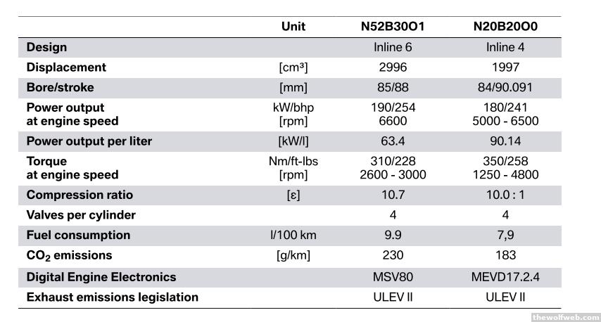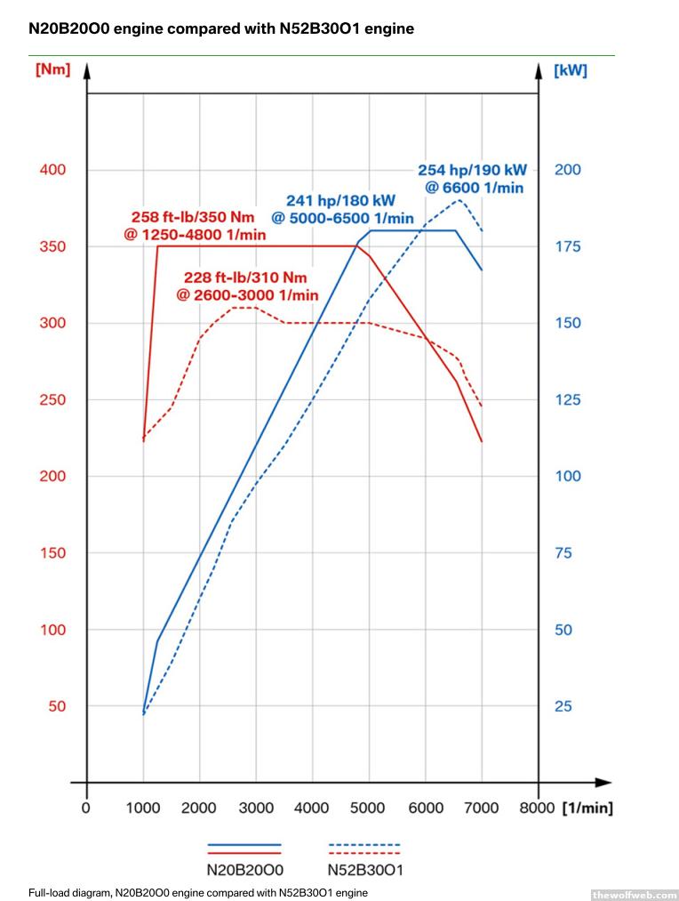 I have briefly mentioned the BMW N20 engine in earlier posts. The N20 is the turbo 4 cylinder replacing the naturally aspirated N52 3.0 inline-6 engine. Having driven an N52-powered E90, it's got the classic BMW I6 feeling. On paper the new N20 has a similar characteristic to many other downsized turbo engines that have been introduced recently.You can see the lower revving nature with a flatter torque curve. It's in many ways an N55 (the I6 twin turbo engine) with 2 less cylinders. According to BMW's internal specs, there is about a 20% decrease in average fuel consumption for the new 3 series: