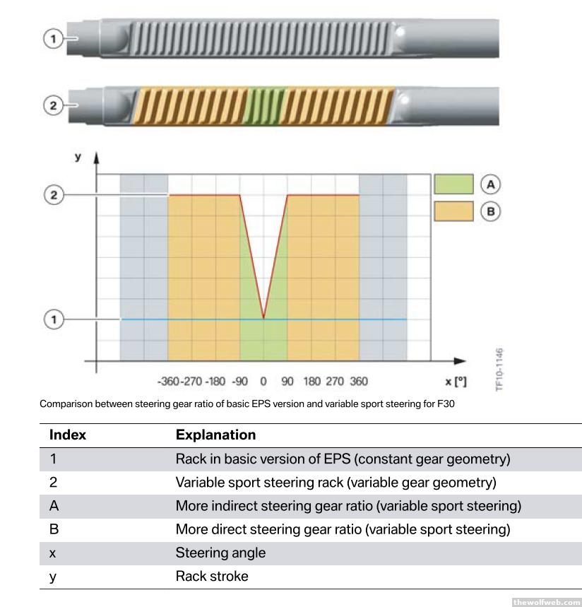 The new BMW F30 3 series uses electric power steering with an available variable ratio system:The system labeled "1" is the basic non-variable electric power steering. The system labeled "2" has the variable ratio rack to make parking maneuvers easier. You can see that the teeth in the center of the rack are shaped differently.