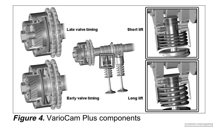 So the 996 Porsche 911 turbo two-step adjustment of intake valve timing and lift/duration. This system uses direct-actuated valves where the cam pushes on a tappet which in turn pushes open the valve. The valve has an inner and outer tappet. Under low lift condition, only the inner tappet moves to open the valve. For high lift, the inner tappet locks into the outer tappet. The cam is ground precisely such that the lobes will actuate the valve at low and high lift while have a certain clearance.Intake valve timing can be advanced a fixed number of degrees by applying oil pressure to push the adjuster in the axial direction. This is sort of like the double VANOS continously variable valve actuation system used in BMW's recent S85 V10 engine. Here are the four possible intake valve timing/lift settings:[Edited on March 6, 2012 at 9:39 PM. Reason : eh?]