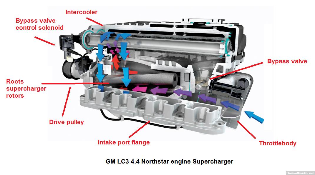 Below is a diagram I have labeled of the supercharger for GM's 4.4 Northstar supercharged engine:This engine was found in the STS-V sedan and XLR-V coupe. The supercharger assembly combined with an air-to-water intercooler for fast response and high torque. You can see that air entered axially through the middle, flowing through the belt-driven rotors and then through runners towards the intake ports. A bypass valve can bleed off boost. The bypass valve used vacuum from before the rotors to open the valve via a diaphragm actuator. The engine control module can also activate a duty-controlled solenoid to operate on the other side of the diaphragm in order to bleed off boost under certain situations.