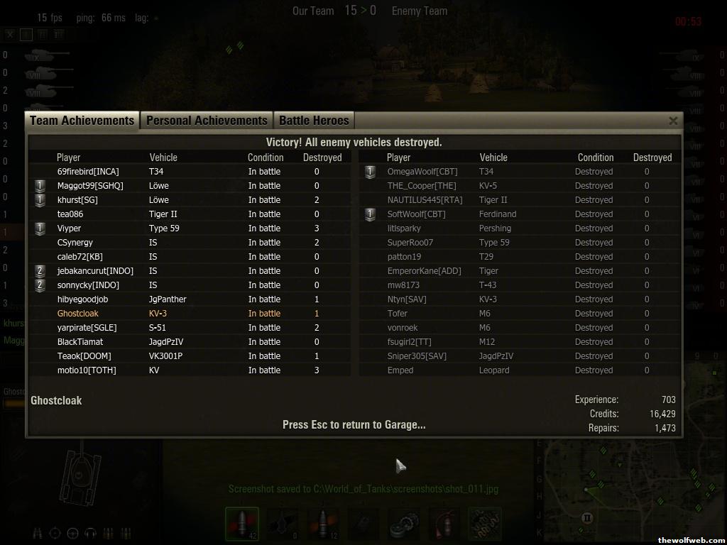 FINALLY got KV-3. Hopefully I can grind and get the IS while it's still on sale tomorrow. We'll see. Also about 2,000 xp away from JagPanther TD, which I'll get once it goes on sale...Players List:Nighthawk - NighthawkCMP (KV*, SU-85*, SU-8*, T-34*, Pz III, Pz38t, M3 & M5 Stuart, & D2) jcdomini - Dominico092bbehe - xBEHExAntecK7 - anteck7 (T34, M4, Panzer III/IV, T28, SU-85B, GBR, Panzer III)wolfpack2105 - wolfpack2105taboo2k - kibongHiro - Ghostcloak (Hetzer*, StuGIII*, JagPd IV*, KV, KV-3 )roguewarrior - gambit61JBaz - RedGuard - Mr. Joshua - Spar -
