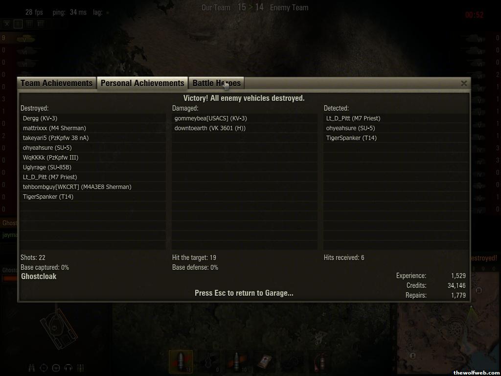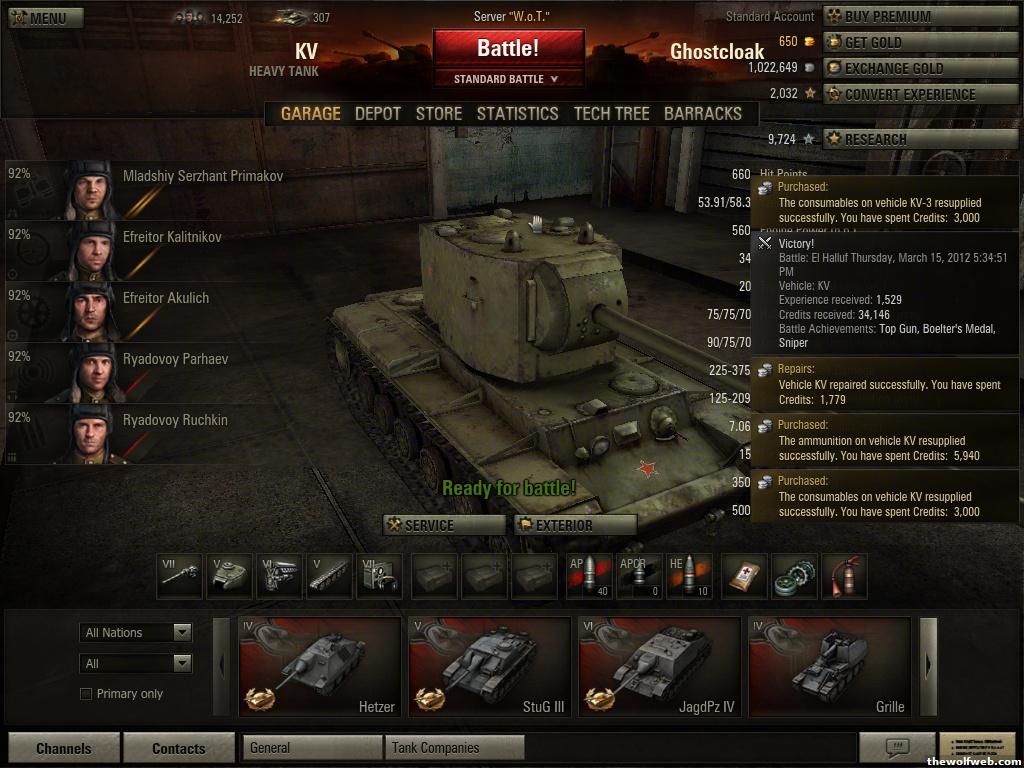 I finally got the upgraded radio, suspension, and mounted the 107 on my KV-3. All crew at 75%. But there is no way in hell I can grind up to that IS tank by 6 am tomorrow. More power to you if you can Hiro. Would help if I was premium I suppose.Players List:Nighthawk - NighthawkCMP (KV-3*, KV*, SU-85*, SU-8*, T-34*, Pz III, Pz38t) jcdomini - Dominico092bbehe - xBEHExAntecK7 - anteck7 (T34, M4, Panzer III/IV, T28, SU-85B, GBR, Panzer III)wolfpack2105 - wolfpack2105taboo2k - kibongHiro - Ghostcloak (Hetzer*, StuGIII*, JagPd IV*, KV, KV-3 )roguewarrior - gambit61JBaz - RedGuard - Mr. Joshua - Spar -