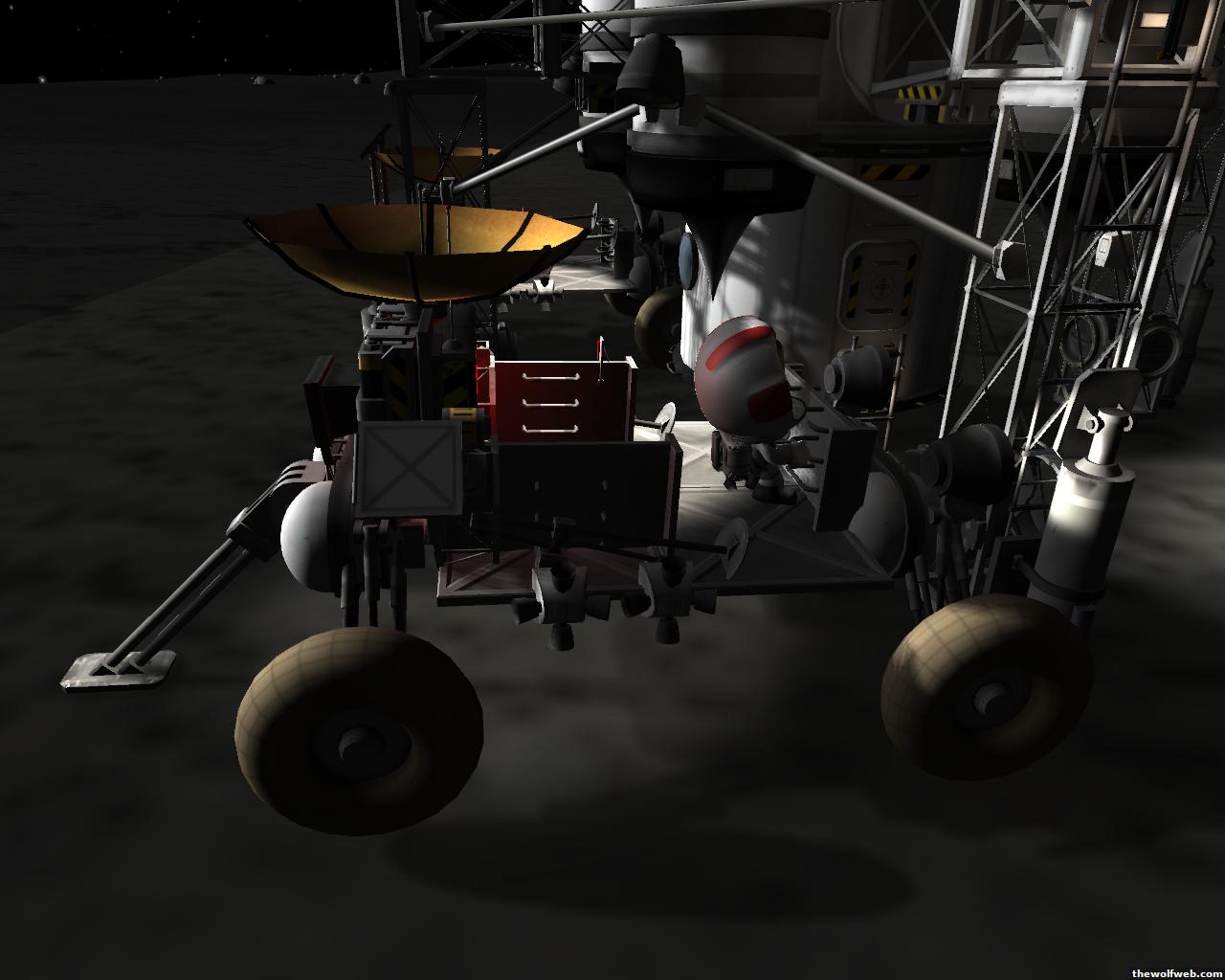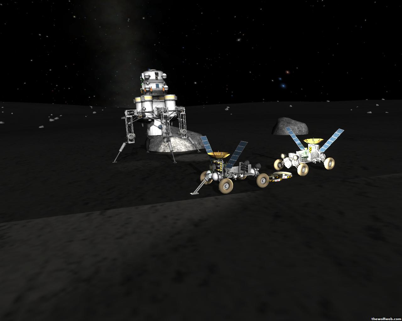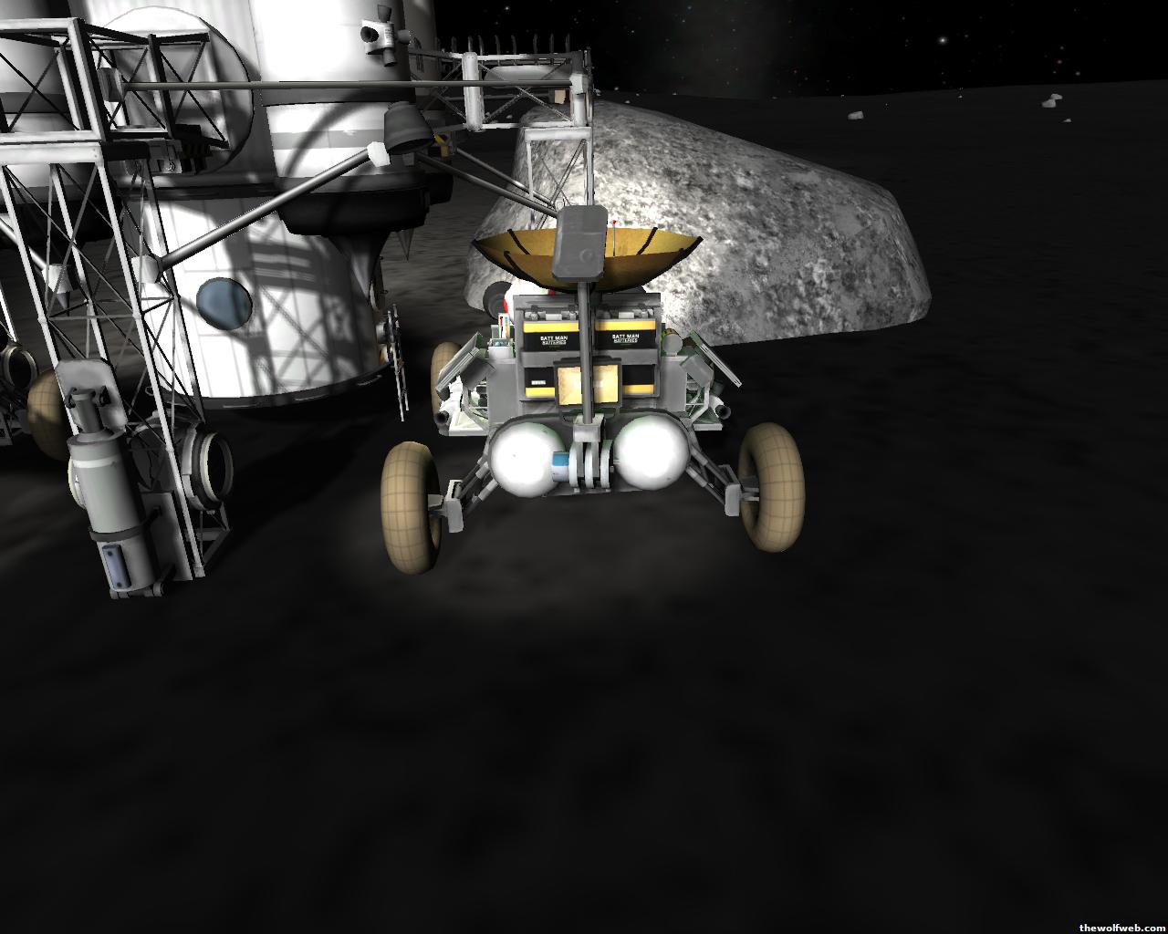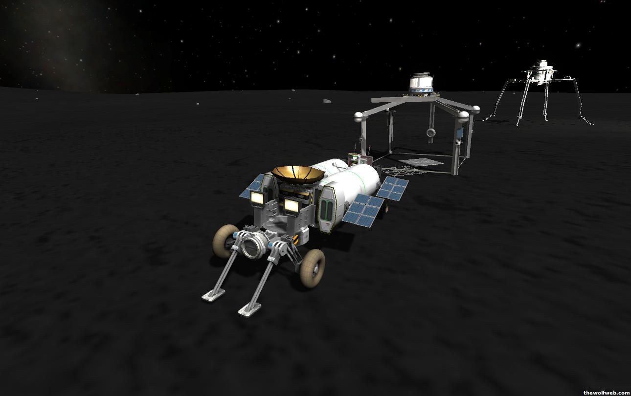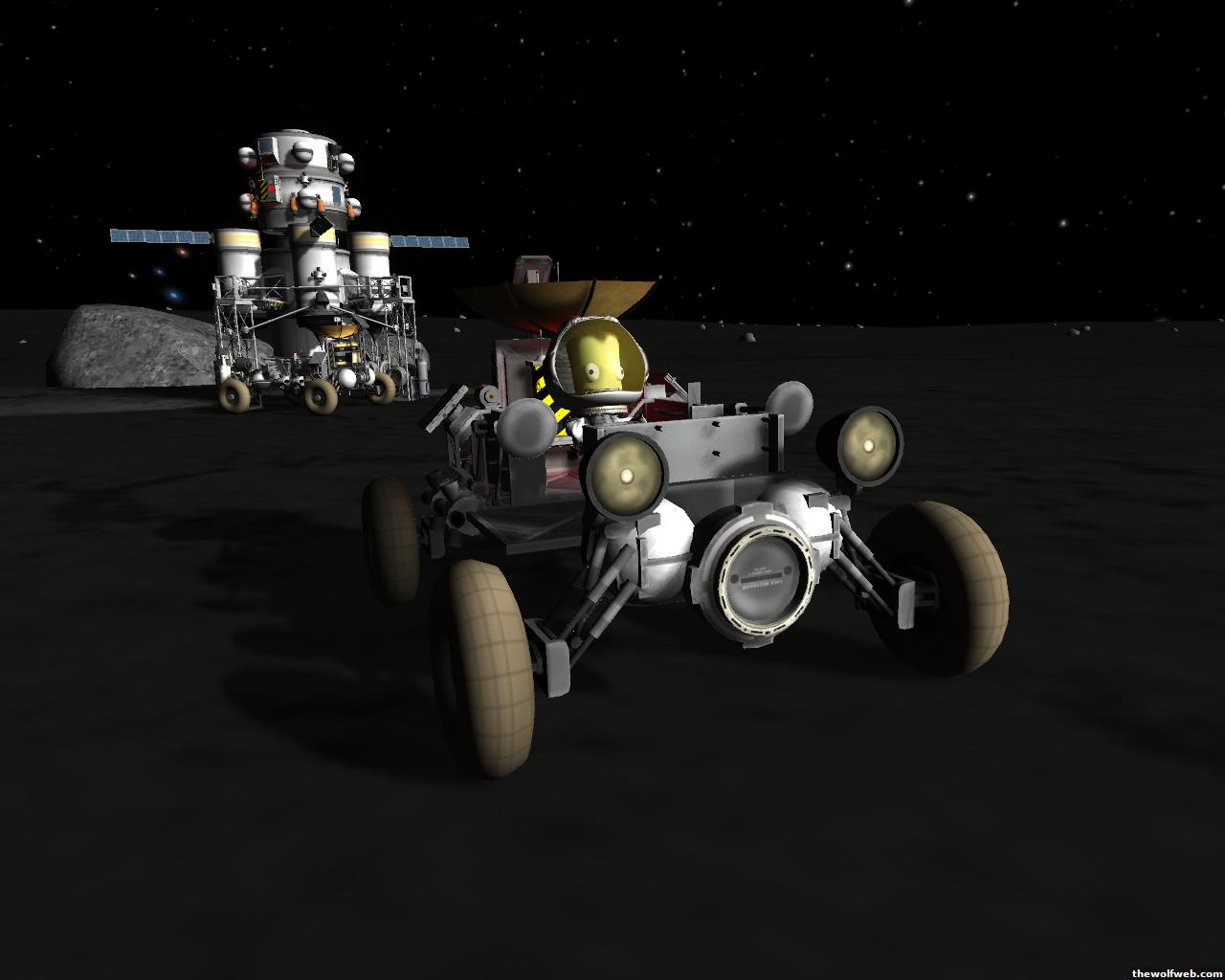 Starting from scratch, part 2. I decided to design a munar rover with a base station on the surface of Mun. The newest version of the game has stock wheels, so everything I have made is all stock, except for mechjeb, kethane, and the topographic map. My first design, launched separately on 2 rockets, and docked. The lander module and the return capsule/service module. Note the rover attached to the bottom. I designed it to be able to land, and then deploy the rover underneath, with just enough clearance.However the damn thing malfunctioned. I used a clampotron jr to attach it, and it worked fine when I tested it on Kerbal, but wouldn't undock so I abandoned it there and returned the crew... Kept the capsule in orbit, and launched a new and improved version of the lander/rover (now with TWO rovers!)Docked with original command module...Orbiting the Mun, with the service module ditched to save fuel.Landed with rovers dropped into place... I had just a little bit of fuel left and had to hover low enough to decouple the rovers... wasn't as challenging as i thought it would be, but i was very concerned on fuel.Designed the rover to dock with the lander when not in use. one can also move underneath and dock if it needed to for whatever reasonThe rovers are "open air" as I wanted a more "Apollo" feel to them. Jeb grabs onto a ladder in the rover and holds on as I drive the rover via Mechjeb. Notice the 3 legs... the one in the back is a "parking brake" for when it's parked, and the two on the side close to hold in Jeb and crew in case they get shaken around while driving.and off he goes...[Edited on March 29, 2013 at 12:36 PM. Reason : ]