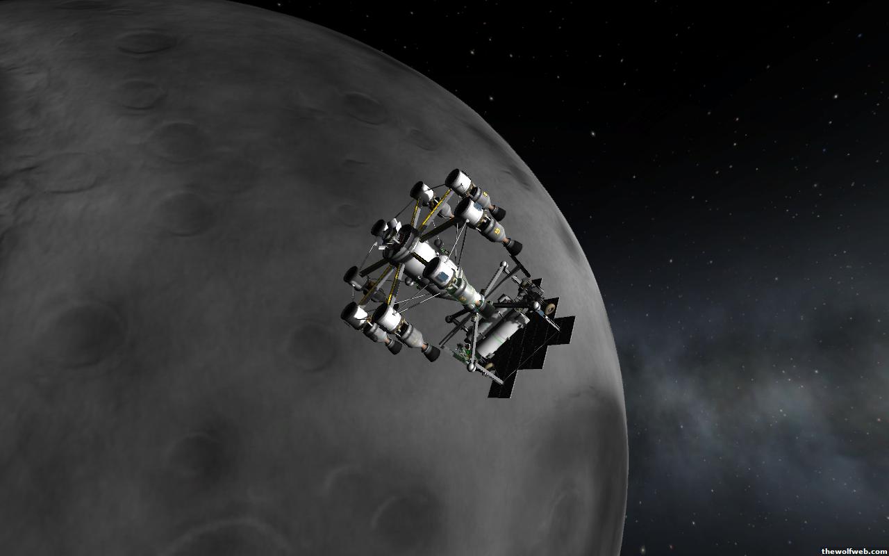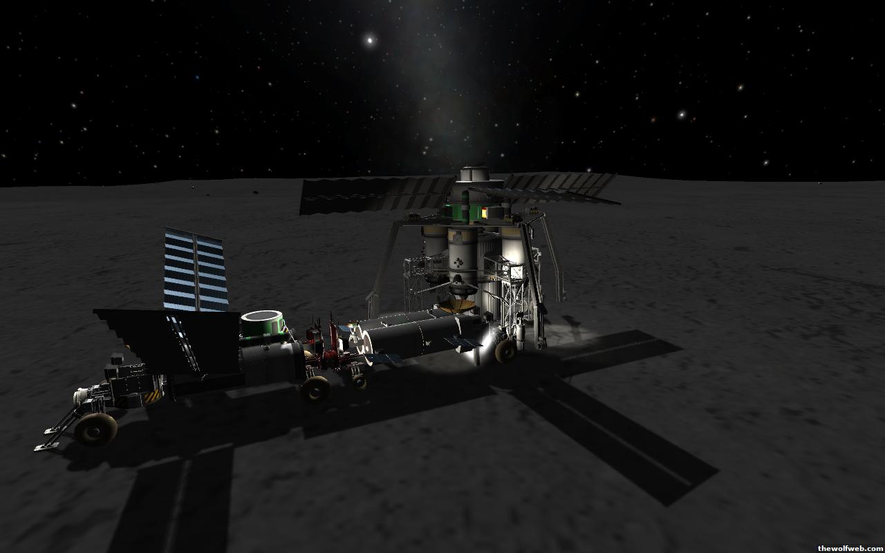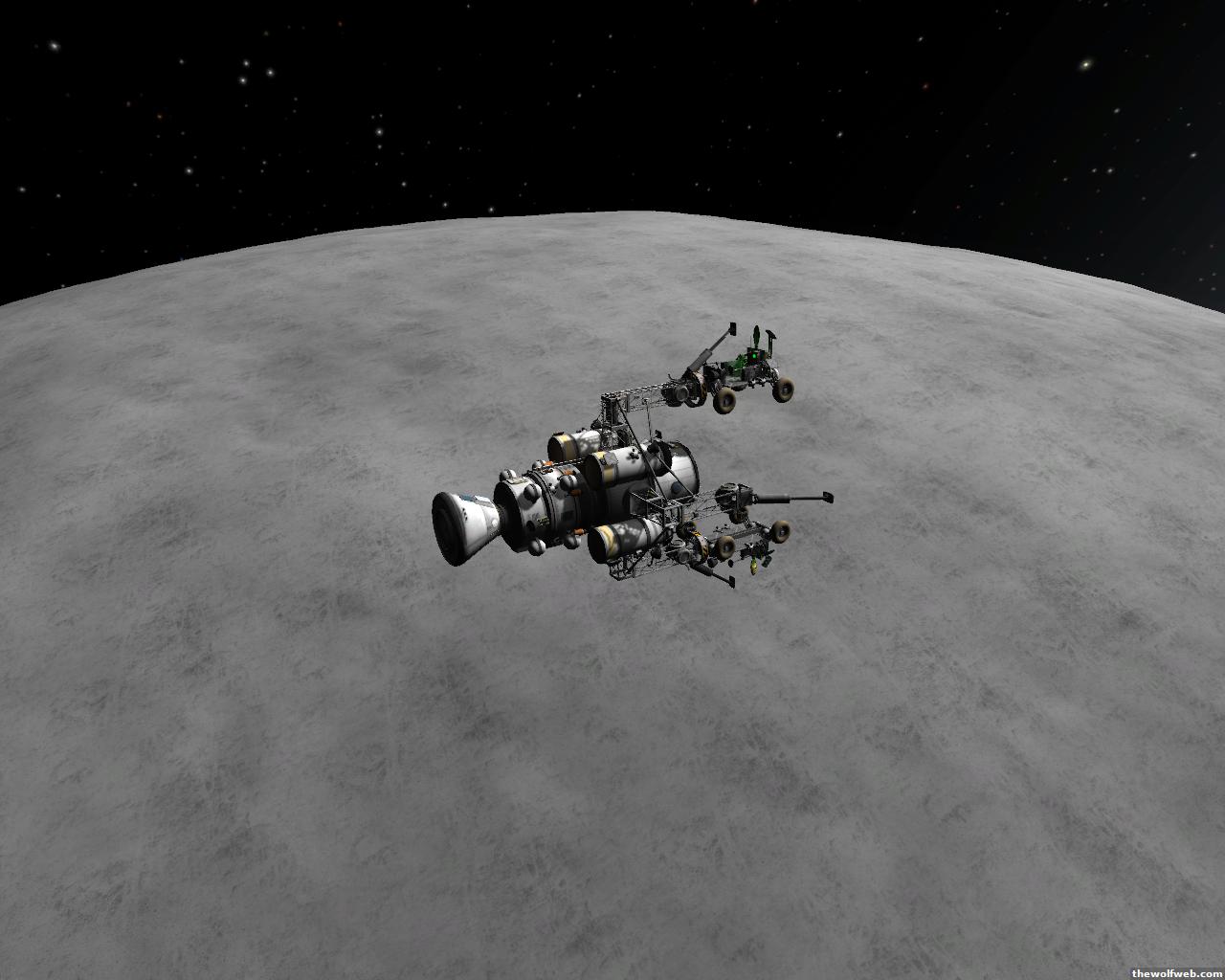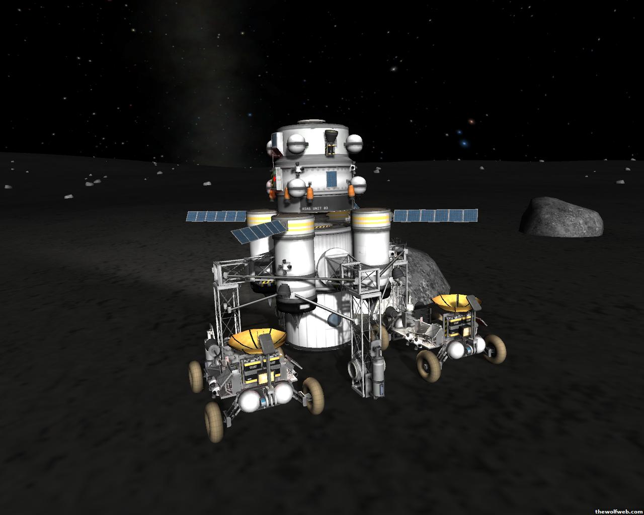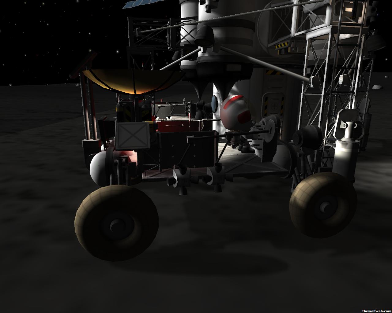 Starting from scratch, part 2. I decided to design a munar rover with a base station on the surface of Mun. The newest version of the game has stock wheels, so everything I have made is all stock, except for mechjeb, kethane, and the topographic map. My first design, launched separately on 2 rockets, and docked. The lander module and the return capsule/service module. Note the rover attached to the bottom. I designed it to be able to land, and then deploy the rover underneath, with just enough clearance.However the damn thing malfunctioned. I used a clampotron jr to attach it, and it worked fine when I tested it on Kerbal, but wouldn't undock so I abandoned it there and returned the crew... Kept the capsule in orbit, and launched a new and improved version of the lander/rover (now with TWO rovers!)Docked with original command module...Orbiting the Mun, with the service module ditched to save fuel.Landed with rovers dropped into place... I had just a little bit of fuel left and had to hover low enough to decouple the rovers... wasn't as challenging as i thought it would be, but i was very concerned on fuel.Designed the rover to dock with the lander when not in use. one can also move underneath and dock if it needed to for whatever reasonThe rovers are "open air" as I wanted a more "Apollo" feel to them. Jeb grabs onto a ladder in the rover and holds on as I drive the rover via Mechjeb. Notice the 3 legs... the one in the back is a "parking brake" for when it's parked, and the two on the side close to hold in Jeb and crew in case they get shaken around while driving.and off he goes...[Edited on March 29, 2013 at 12:36 PM. Reason : ]