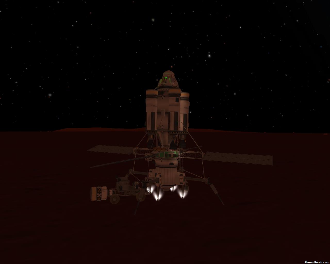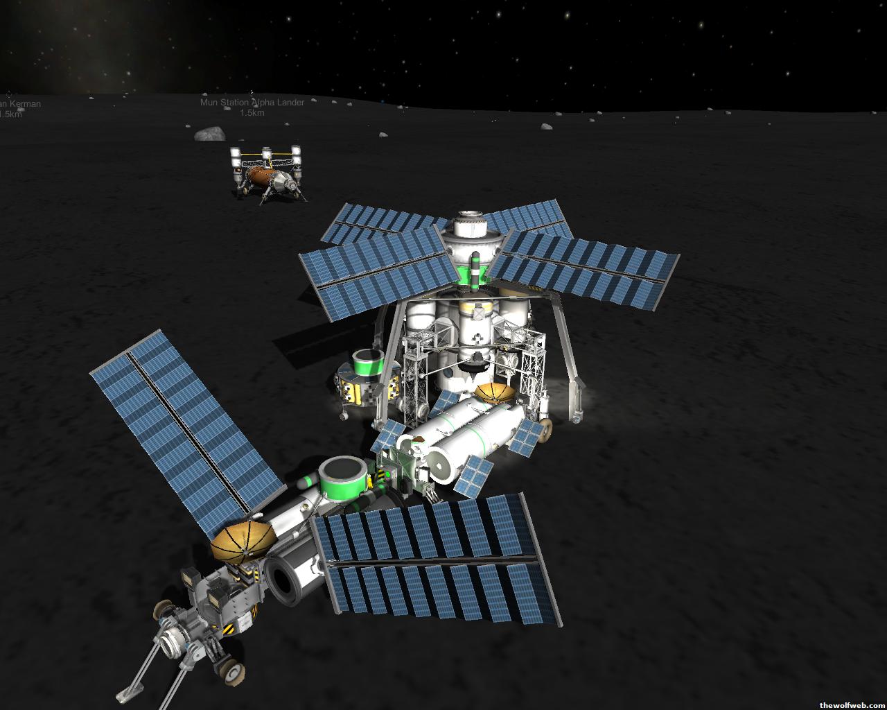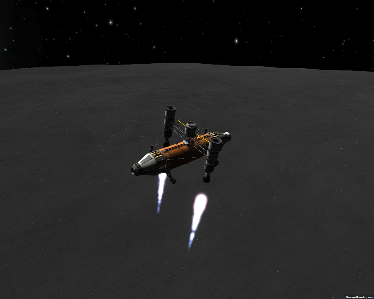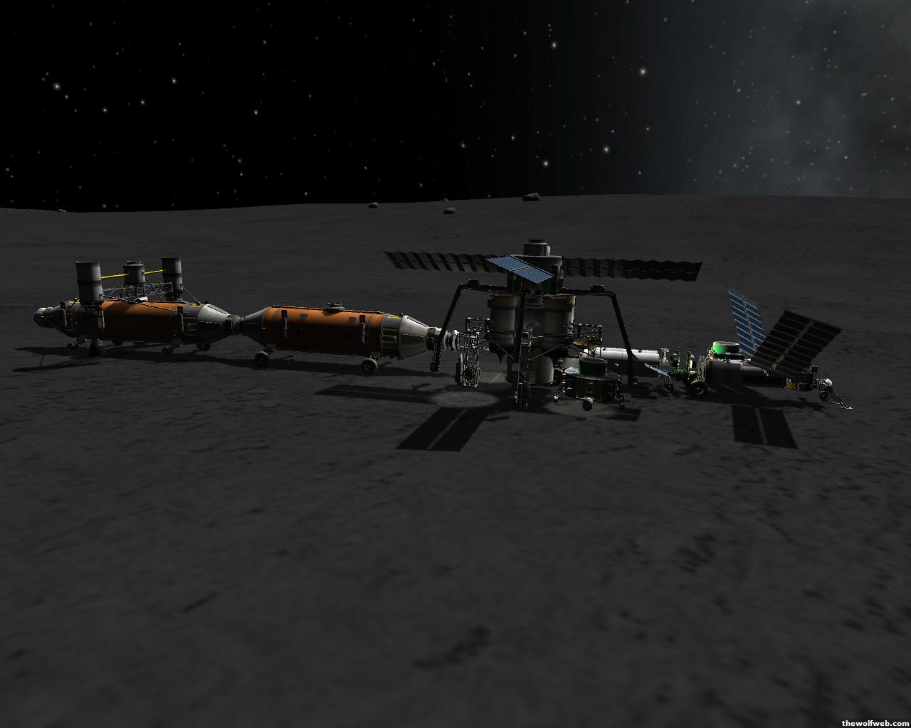 Starting from scratch, part 2. I decided to design a munar rover with a base station on the surface of Mun. The newest version of the game has stock wheels, so everything I have made is all stock, except for mechjeb, kethane, and the topographic map. My first design, launched separately on 2 rockets, and docked. The lander module and the return capsule/service module. Note the rover attached to the bottom. I designed it to be able to land, and then deploy the rover underneath, with just enough clearance.However the damn thing malfunctioned. I used a clampotron jr to attach it, and it worked fine when I tested it on Kerbal, but wouldn't undock so I abandoned it there and returned the crew... Kept the capsule in orbit, and launched a new and improved version of the lander/rover (now with TWO rovers!)Docked with original command module...Orbiting the Mun, with the service module ditched to save fuel.Landed with rovers dropped into place... I had just a little bit of fuel left and had to hover low enough to decouple the rovers... wasn't as challenging as i thought it would be, but i was very concerned on fuel.Designed the rover to dock with the lander when not in use. one can also move underneath and dock if it needed to for whatever reasonThe rovers are "open air" as I wanted a more "Apollo" feel to them. Jeb grabs onto a ladder in the rover and holds on as I drive the rover via Mechjeb. Notice the 3 legs... the one in the back is a "parking brake" for when it's parked, and the two on the side close to hold in Jeb and crew in case they get shaken around while driving.and off he goes...[Edited on March 29, 2013 at 12:36 PM. Reason : ]