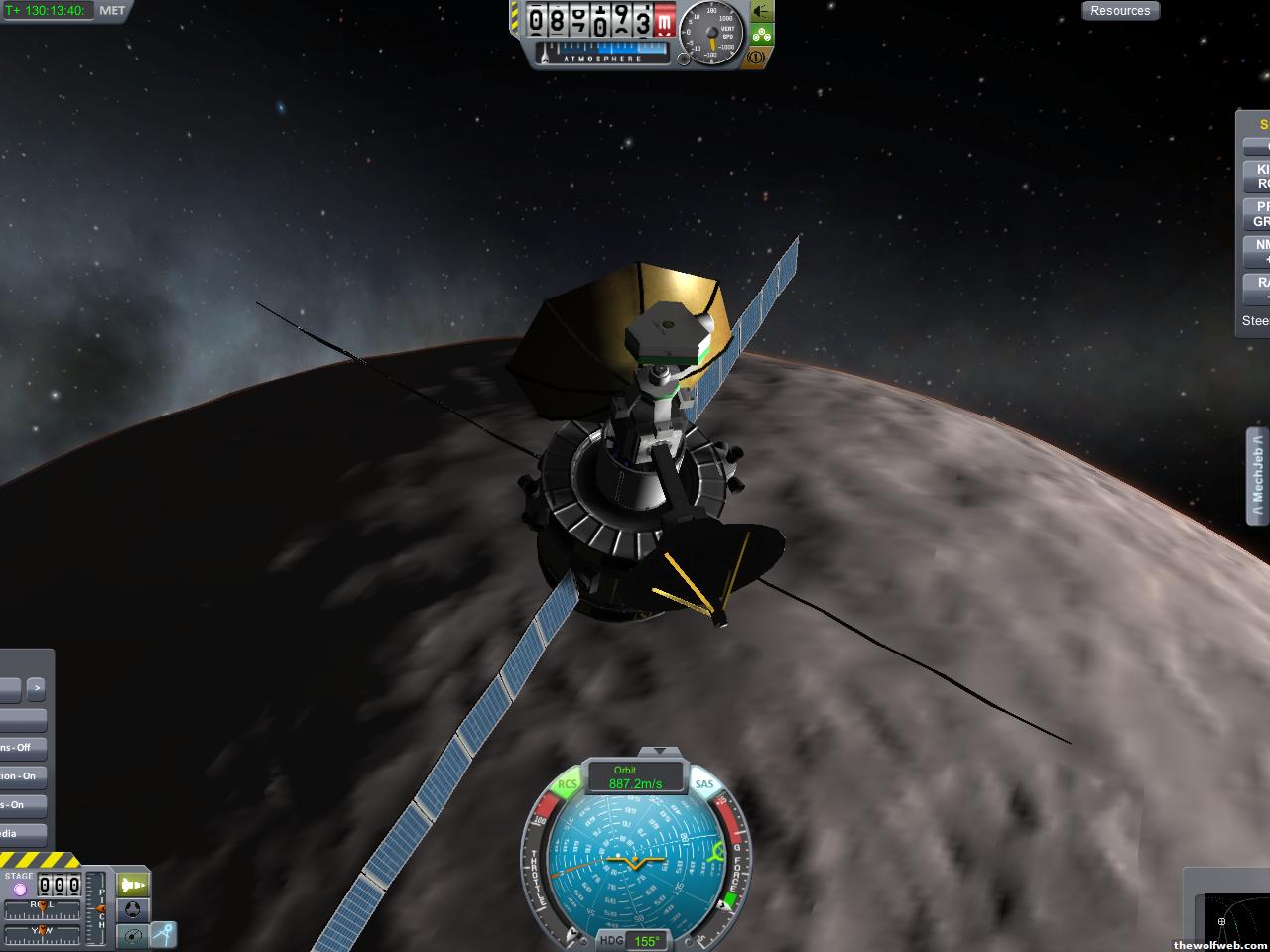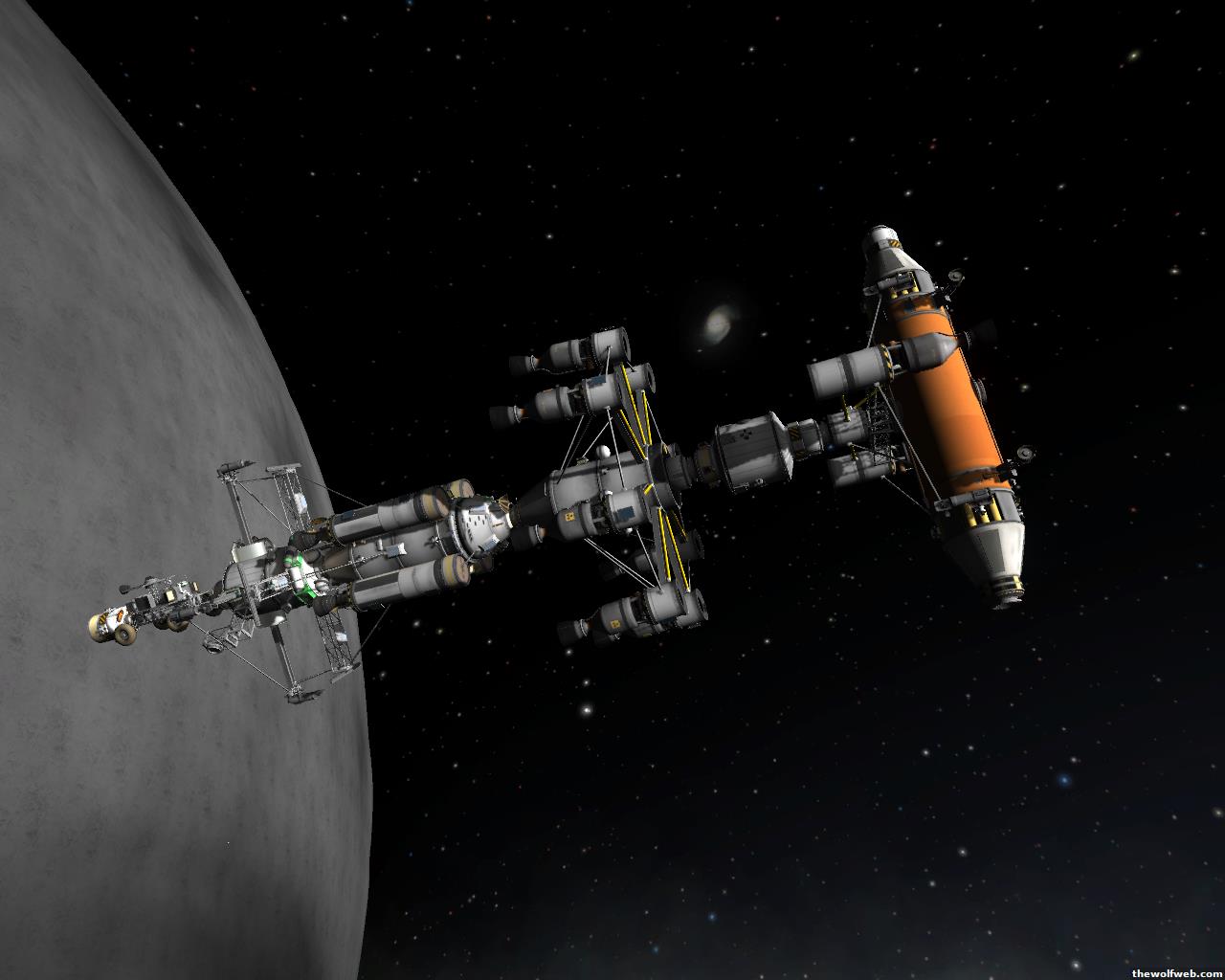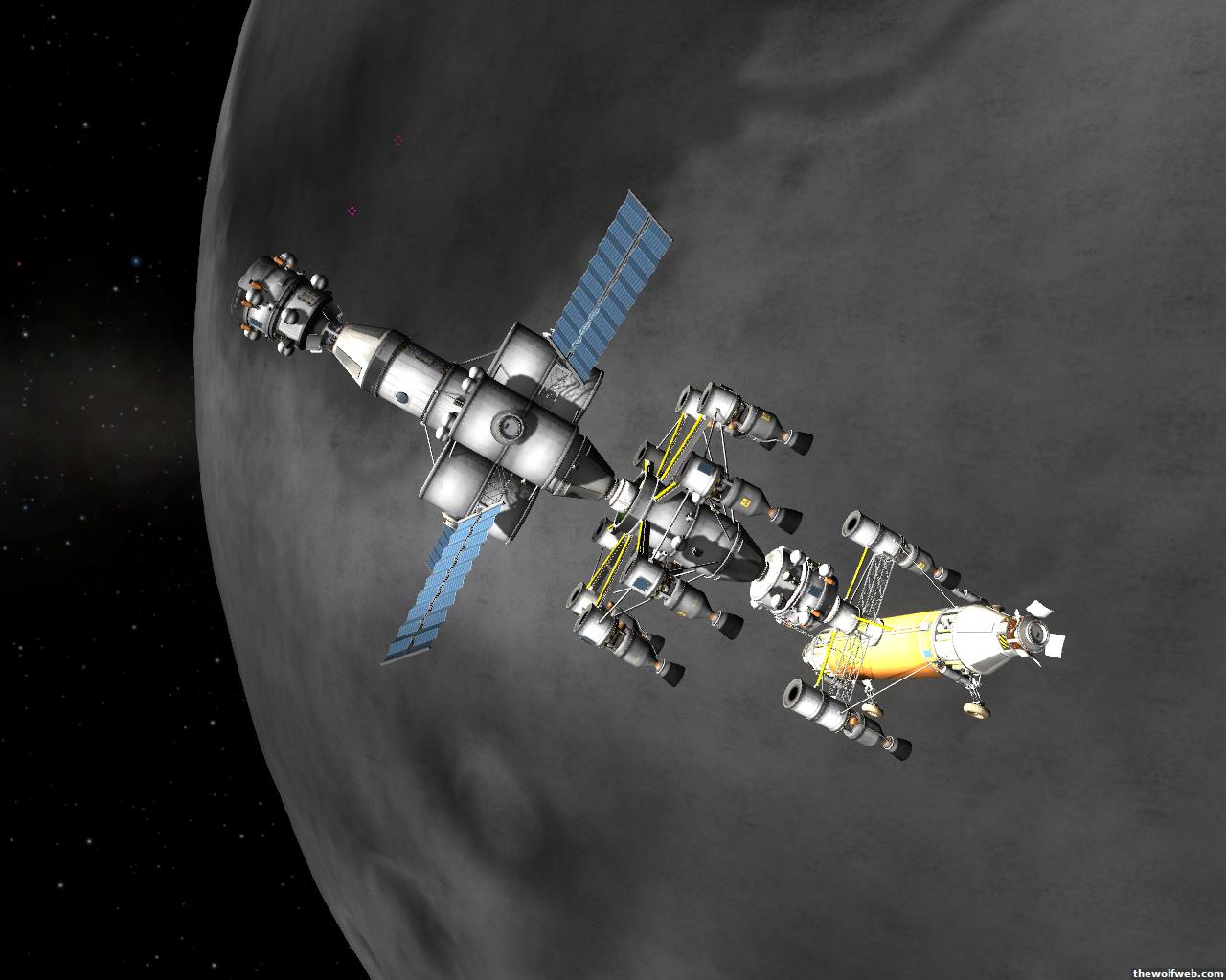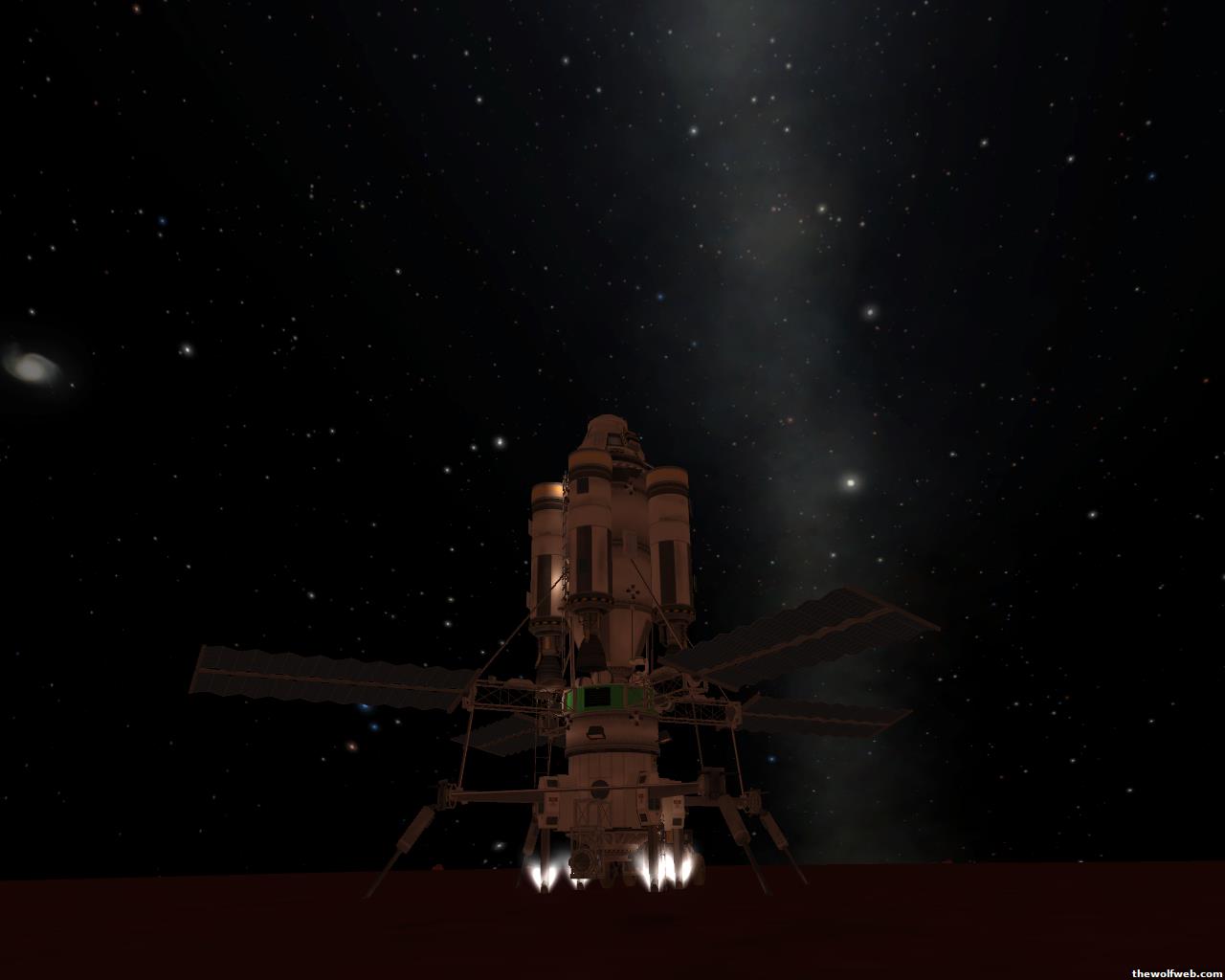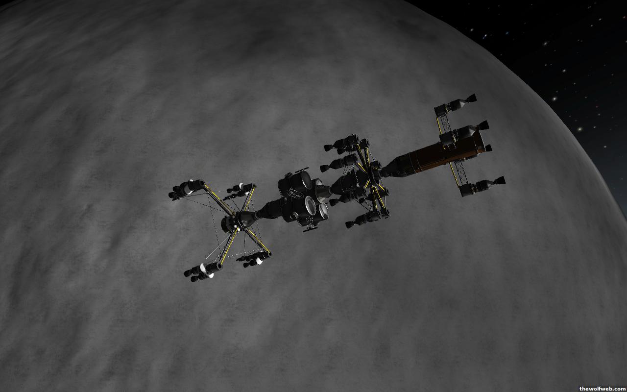 Starting from scratch, part 2. I decided to design a munar rover with a base station on the surface of Mun. The newest version of the game has stock wheels, so everything I have made is all stock, except for mechjeb, kethane, and the topographic map. My first design, launched separately on 2 rockets, and docked. The lander module and the return capsule/service module. Note the rover attached to the bottom. I designed it to be able to land, and then deploy the rover underneath, with just enough clearance.However the damn thing malfunctioned. I used a clampotron jr to attach it, and it worked fine when I tested it on Kerbal, but wouldn't undock so I abandoned it there and returned the crew... Kept the capsule in orbit, and launched a new and improved version of the lander/rover (now with TWO rovers!)Docked with original command module...Orbiting the Mun, with the service module ditched to save fuel.Landed with rovers dropped into place... I had just a little bit of fuel left and had to hover low enough to decouple the rovers... wasn't as challenging as i thought it would be, but i was very concerned on fuel.Designed the rover to dock with the lander when not in use. one can also move underneath and dock if it needed to for whatever reasonThe rovers are "open air" as I wanted a more "Apollo" feel to them. Jeb grabs onto a ladder in the rover and holds on as I drive the rover via Mechjeb. Notice the 3 legs... the one in the back is a "parking brake" for when it's parked, and the two on the side close to hold in Jeb and crew in case they get shaken around while driving.and off he goes...[Edited on March 29, 2013 at 12:36 PM. Reason : ]