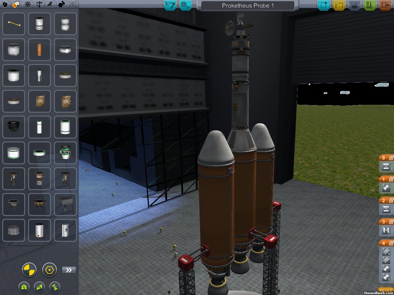 Here is what my probe looked like in the VAB. Note the triple orange tank configuration for the lower stage... This configuration is based off of the Delta IV Heavy rocket and I've had the most success building stable, mid-heavy lift rockets with this design. Sometimes I use the same configuration except with 3 sets of 2 orange tanks each. The main difference between this config and the real thing is crossfeed... my middle tank drains the outer tanks and once the outer tanks drop off, the middle tank is still full, which I use as my "second stage"sometimes I add solids to the outer tanks if i need an extra kick in the pants.
