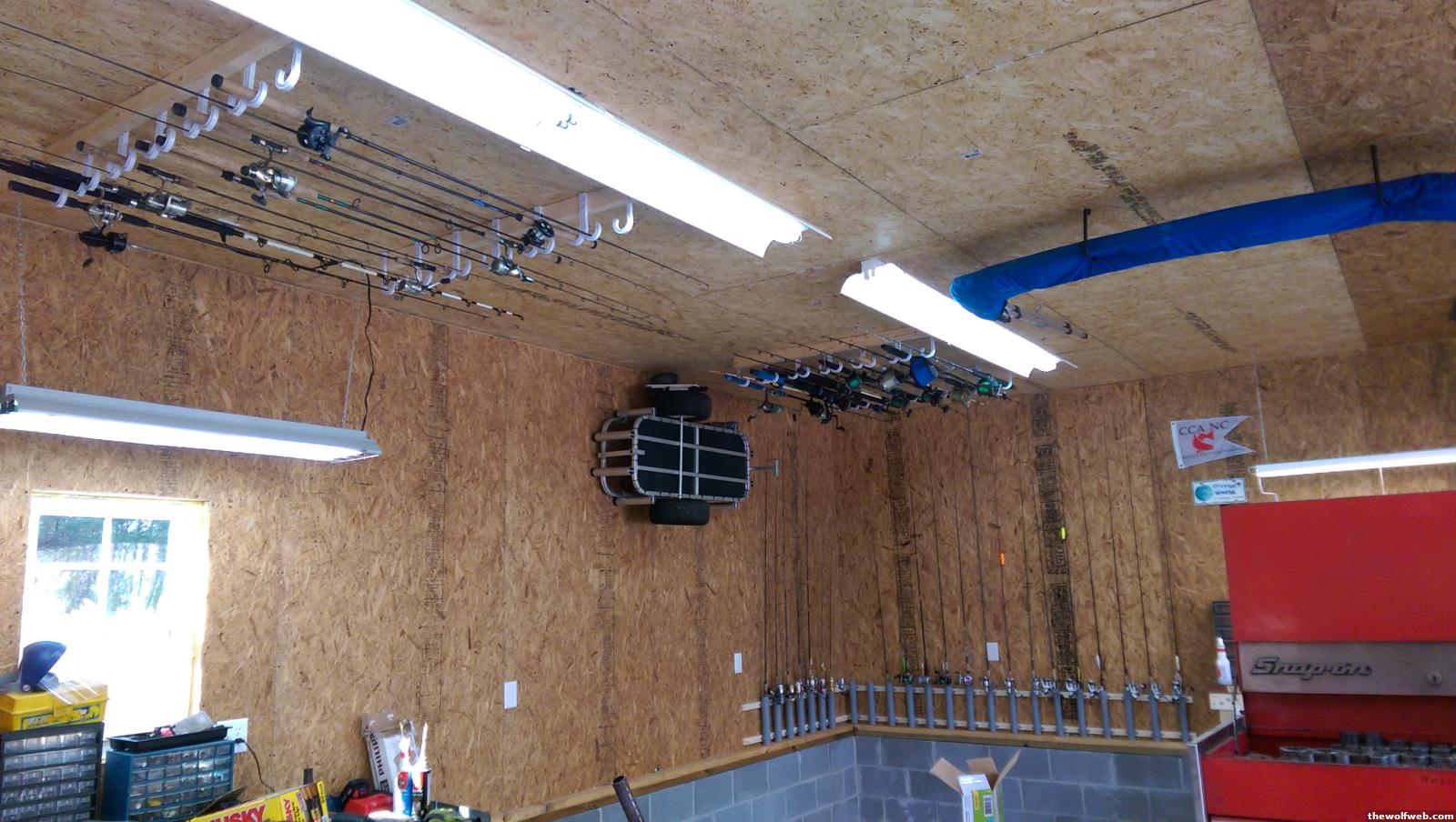 gonna try to get the fishing stuff organized on the boat side of the shop this week. gonna build another 16 ft of shelf, put the frequently used rods on the wall in the back corner, put the infrequently used rods on the ceiling over the garage door, and build a short workbench for fishing tackle and such.