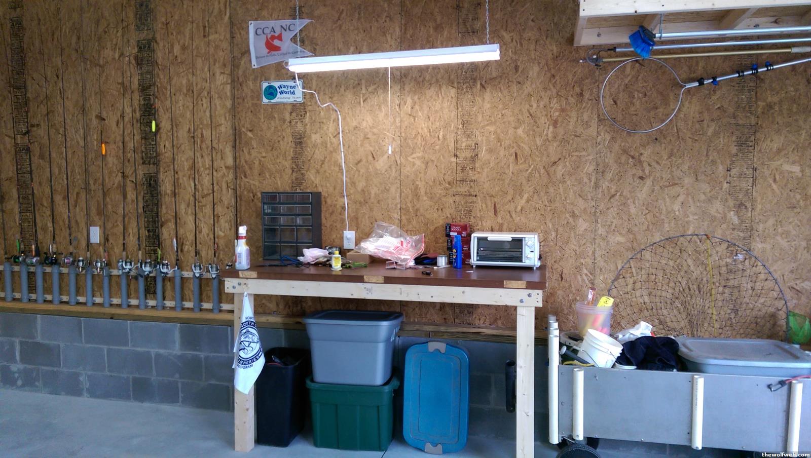 fishing rod storage. the stuff i use most frequently is on the wall. the infrequently used rods are on the ceiling. also hung a pier/surf fishing cart on the wall and the bimini top for the boat on the ceiling (i never use the bimini):workbench for fishing stuff. top is made from a solid core door i got from a nursing home:got some active speakers and made some little shelves for them. i just plug up my phone and use spotify.[Edited on April 4, 2015 at 7:48 PM. Reason : DS]