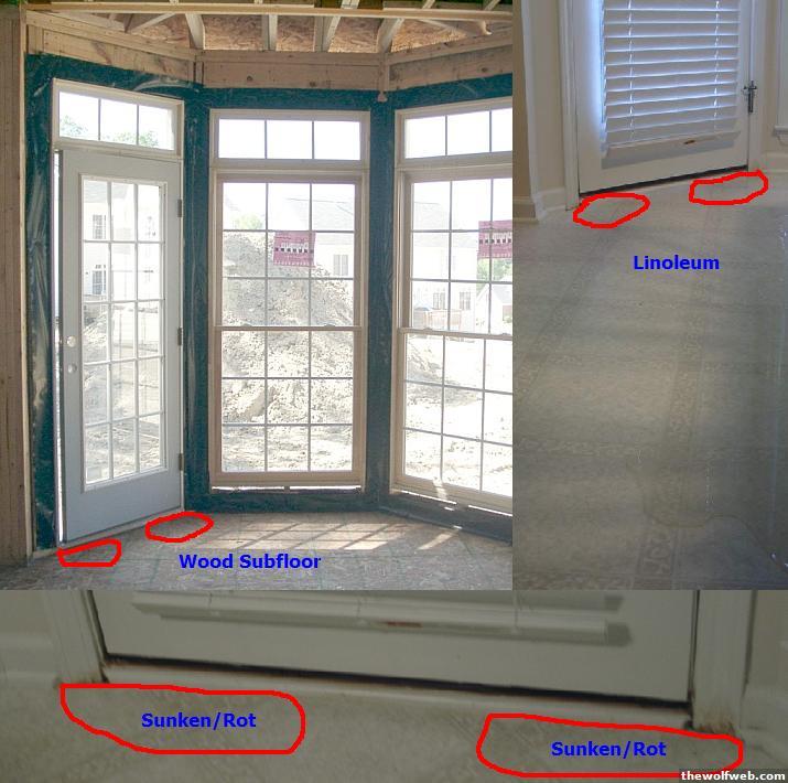 The backdoor leads to a deck. The water has probably been coming in through the gap in the bottom of the backdoor and then down beneath the linoleum. I'm not sure how long. I am located in Apex.