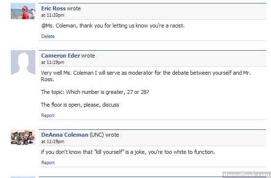 Considering that these people should be moderately intelligent individuals, it's borderline insane to make t-shirts and facebook groups stating that NCSU is not UNC's rival. If that was truly the case, the facebook group, the t-shirts, and all of their mindless self-absorbed ranting on that wall, would not exist in the first place. Contrary to their middle school reasoning skills, many people that went to NCSU, were also accepted into UNC. Logic is difficult for those that make life decisions based on facades that they purchased, but hopefully this obvious truth will sink in, or perhaps not.[Edited on December 1, 2009 at 4:34 PM. Reason : -]