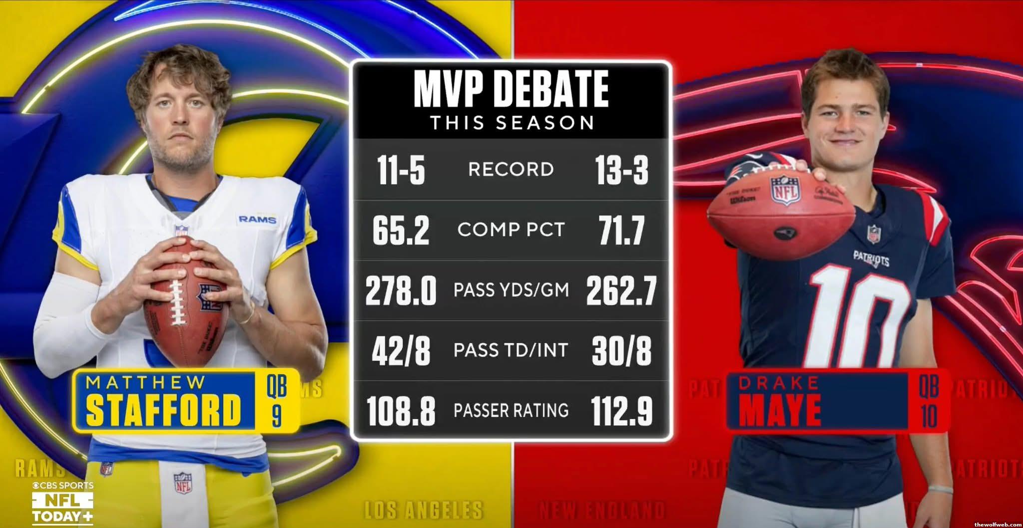Rams also had the 9th most difficult schedule this year, Patriots had the 32nd most difficult (out of 32 teams)^^Stafford had 15 more passing TD as well (Maye had 6 more rushing TDs)]