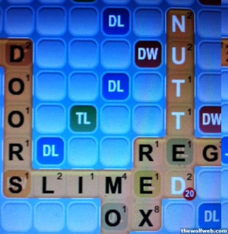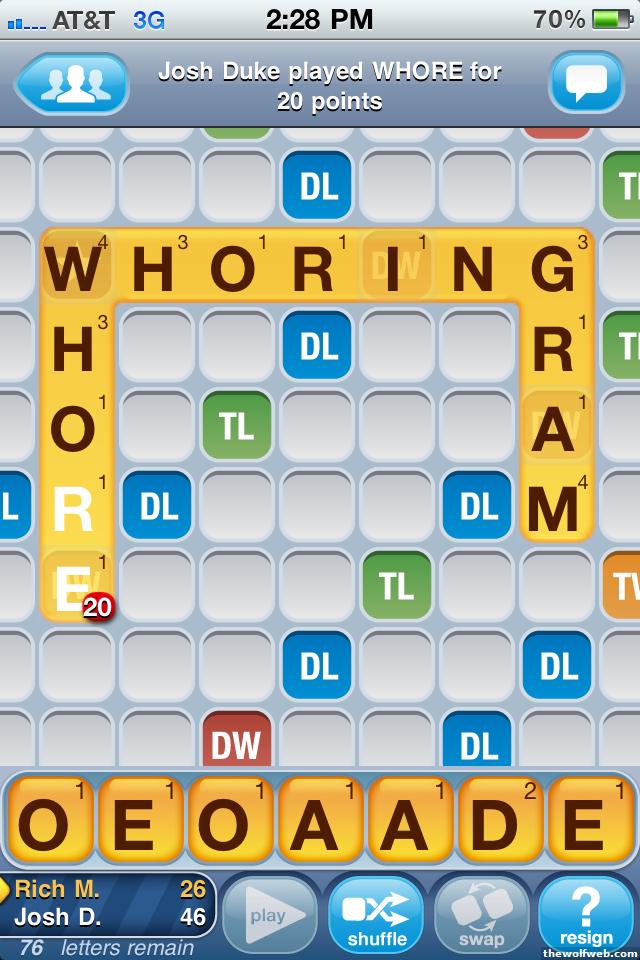 Opened the game with "WHORING", then shortly thereafter played "WHORE" to intersect it.Notable for scoring 111 points, and also because it let me use "OFAY", hahaha."NUTTED" played to intersect "SLIMED"; 'nuff said. haha