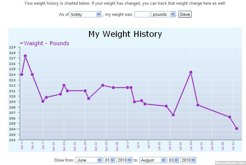 How's this for progress?Over the past 2 months, I've lost ~10-14 lbs., depending on when I start.June 1st, I was 214, June 2nd, I was 217.4This past Sunday, I was 204.1I try not to worry about what the scale says, but I know for a fact that my clothes fit much better and by the questions and compliments from friends about looking like I've lost weight keep coming. Also, I was 228 in April of 2009.I have started using 2 new holes on my belt. These are some of my measurements from just 2 months of keeping track:-3" from my waist-1.5" from my hips-1.25" from my left thigh-1.5" from my right thigh +1.75 to my chesthere are the before and after shots, sorry for the crappy photos:My diet and my knowledge have improved considerably, many thanks to the people in this thread