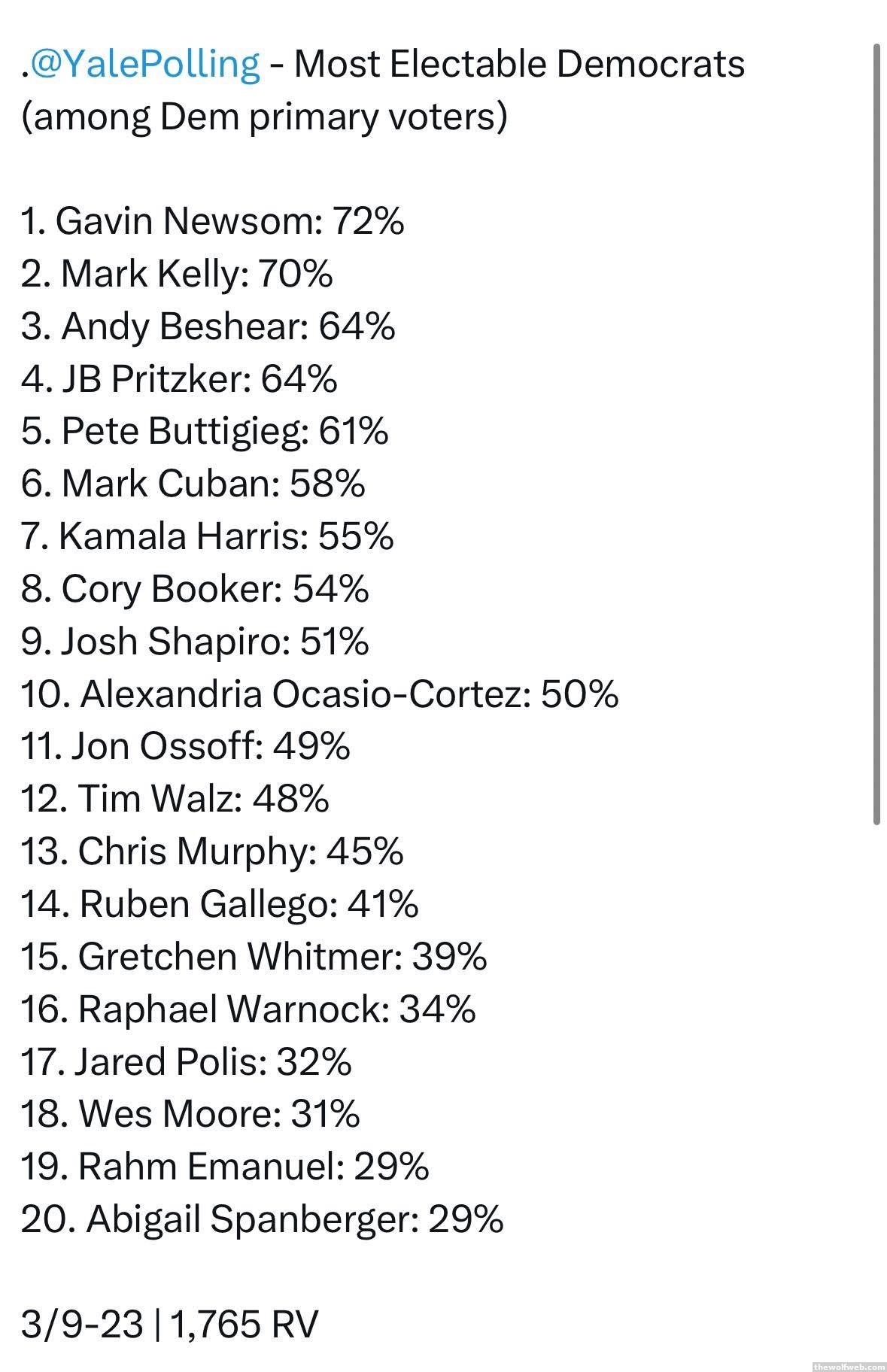 I'd say wes moore and gavin Newsom are my 2 least favorite options. California isn't really a good example to the rest of the nation, and wes moore has a biography issue and never strikes me as genuine.