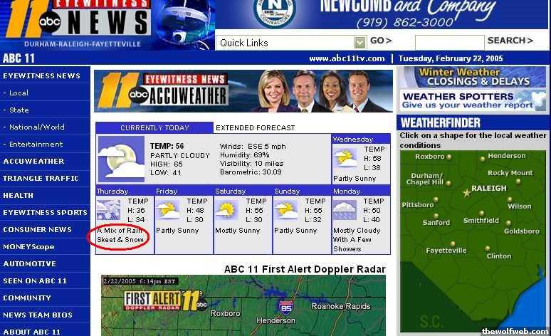 (Per WUnderground) 5-Day Forecast for Northern VirginiaTuesday.......Wednesday........Thursday........Friday.............Saturday[Clear].......[Partly Cloudy]...[Ice Pellets]..[Chance of Snow]..[Partly Cloudy]33 ° | 13 °....30 ° | 20 °......31 ° | 29 °.....42 ° | 25 °........45 ° | 25 °.......................................60% chance...40% chance...........................What's next, locusts?[Edited on December 13, 2005 at 9:28 AM. Reason : .]