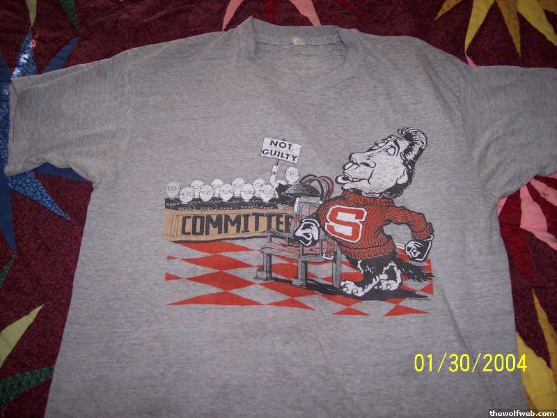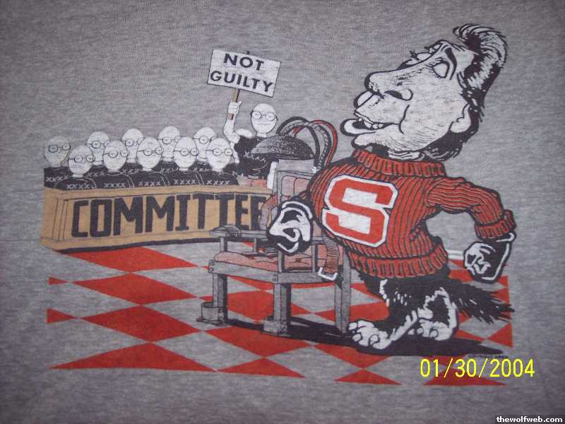 ooh i found that old photo from the 40s. well i've known that, i'm just saying that i've never seen the Tuffy logo without the N and C in the block S on his sweater, and that shirt has a caricature of Jimmy V's head on Tuffy's body. maybe it was made without the N or C for legal reasons? i'm guessing that's not a shirt that was released or made by NCSU?[Edited on May 18, 2006 at 8:16 PM. Reason : ]