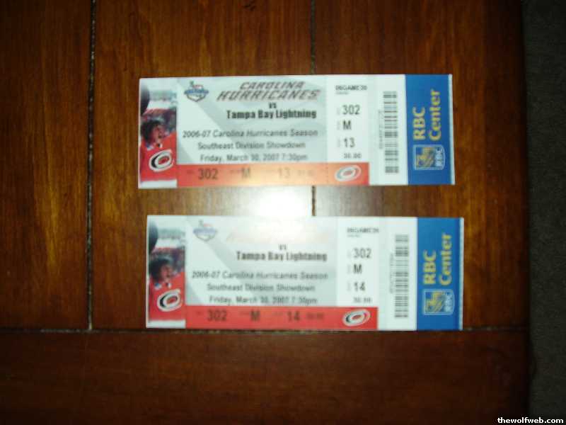 2 tickets, Canes vs. Tampa Bay Lightning. Friday March 30, 2007 @7:30pm. Section 302, Row M, Seats 13 & 14. Face Value $30.00 each.