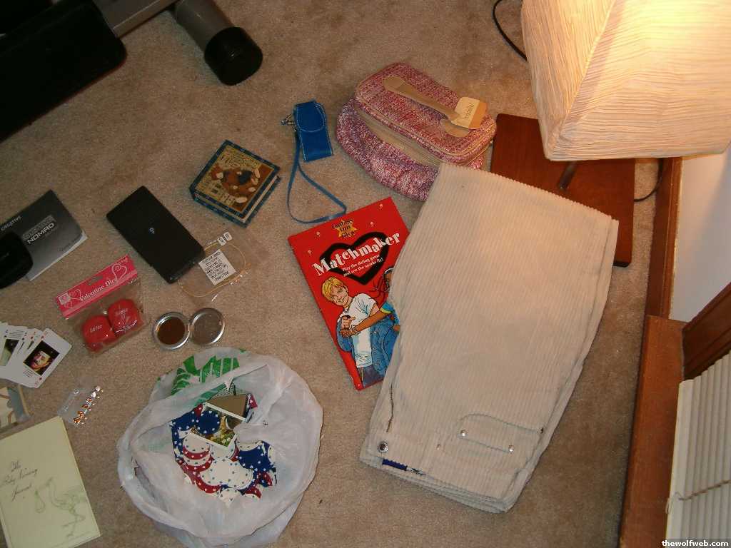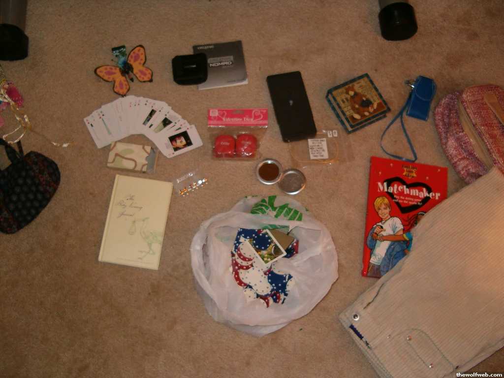 Pack of "Most Wanted" cards, Butterfly hang thing, 3 pack of pearl earrings, brand new baby naming book, big bag of poker chips/cards, brand new dice (w/ sexual stuff on them), cosmetic purse mirror, some matchmaker book game, a brand new one of those bracelet/anklets that you wear until it breaks and your "wish comes true", TI82 calculator, bear coasters (new), cell phone holder, 30 x 30 curd. pants & brand new cosmetic bag. Oh and the MP3 player is like a Creative Muvo2 I think. Needs a USB 2.0 cord.