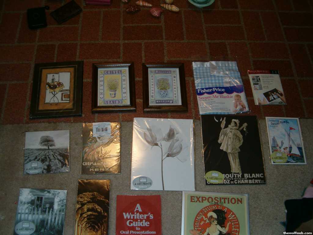 Okay in these pics, there are 4 framed pictures, 7 packs of 4 art prints (new), a brand new baby blanket (new), A Writer's Guide to Oral Presentations, 2 new prints (not in package), Magnetic picture frames (new in package), a new in package wood piece of artwork.