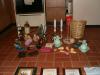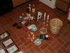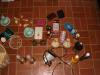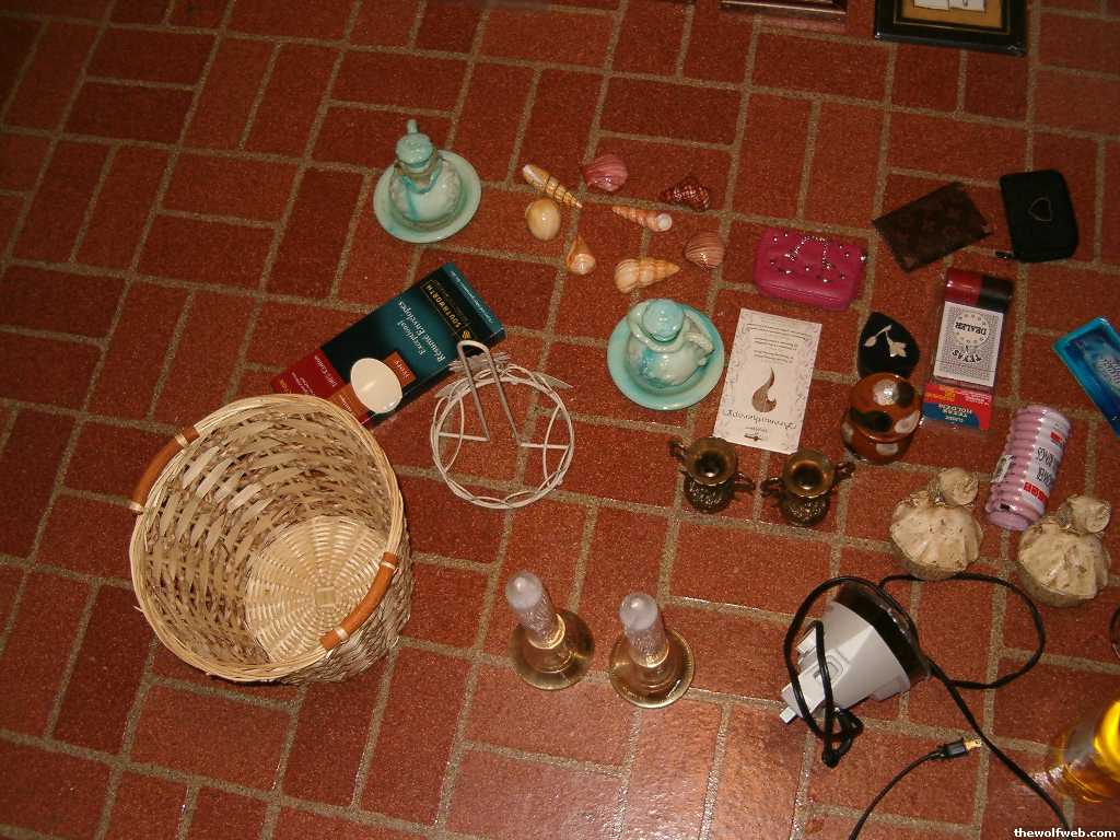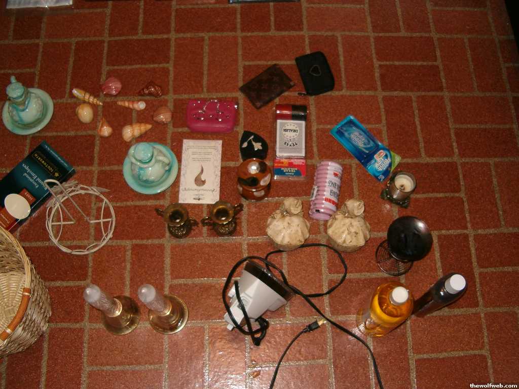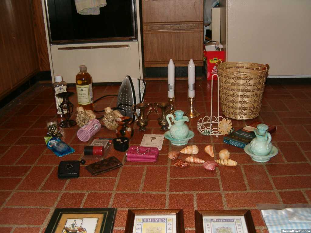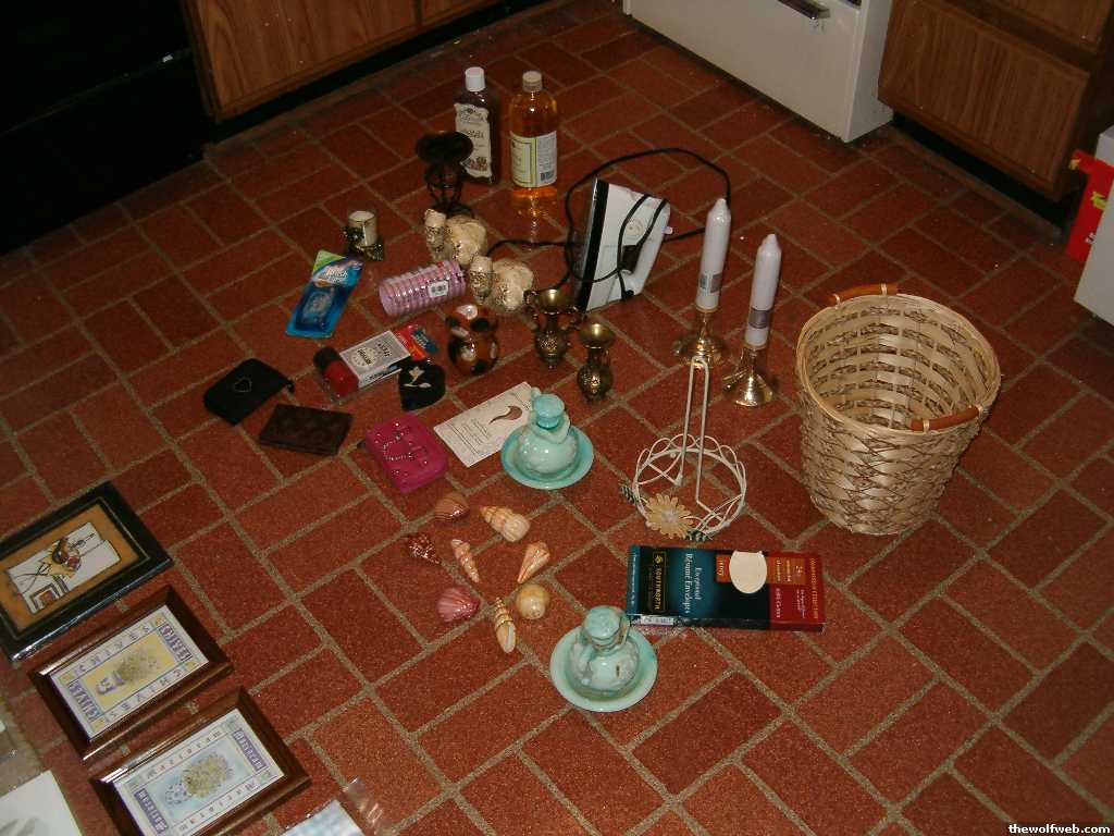 Okay in these pics, there are two bottles of potpourri stuff, three candle holders, shower rings, a brand new Brush Up pack, 3 wallets, a marble/stone very tiny jewelry thing, a brand new poker set w/ cards, two monkey candles, two gold vases, an iron, two brand new tall candles + candle holders, two vintage Avon blue bottle things, new package of incense, a trashcan, a floral papertowel holder, resume envelopes & a set of 8 glass seashells for a bathroom.
