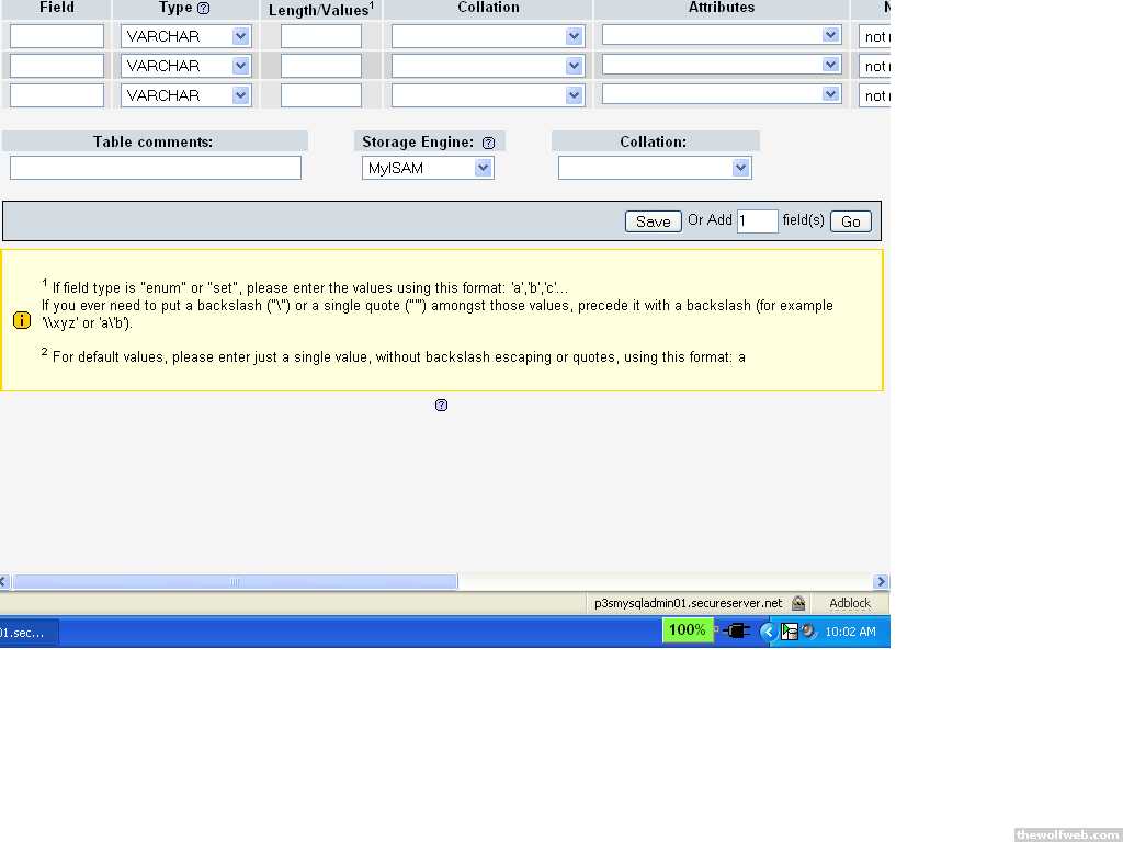 good deal. yeah. that link above your post has also helped. im using godaddy hosting and they have 1 free SQL database i can make. so it asks for a new table, i named it comment and "number of fields" is 3 ( Name, Email, Comment )so then on this page i insert the fields. do i do anything to the other spaces?im actually starting to get the hang of this. i think i can do most of it except setup the database with different variables here and there.[Edited on May 16, 2008 at 10:08 AM. Reason : ]