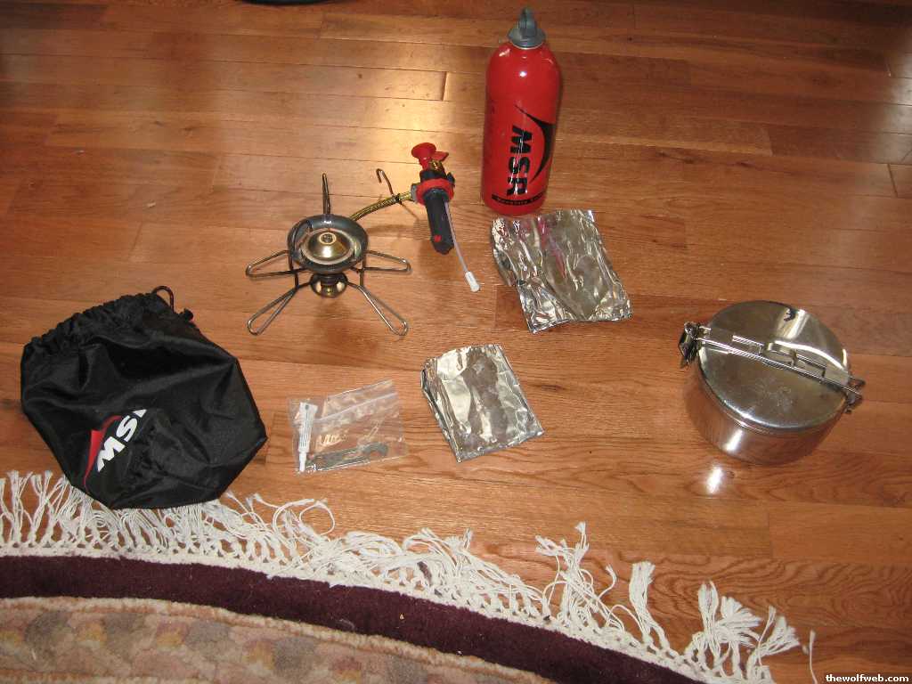 MSR Whisperlite + MSR pot + MSR fuel bottle (includes windscreen and mini rpair kit) - $35