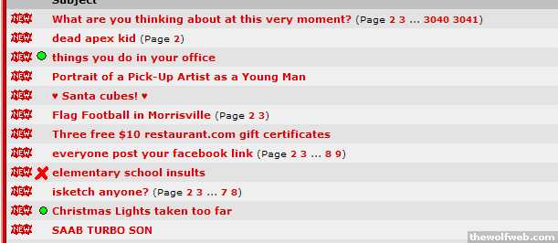 i'd like to see a personal flag option. i want to have a little indicator when a user a's thread is on a page or a little red x indicator when user b's thread is on a page. you could wedge the gif between / and the thread title. just something to pop when i look along the left hand side of a board.